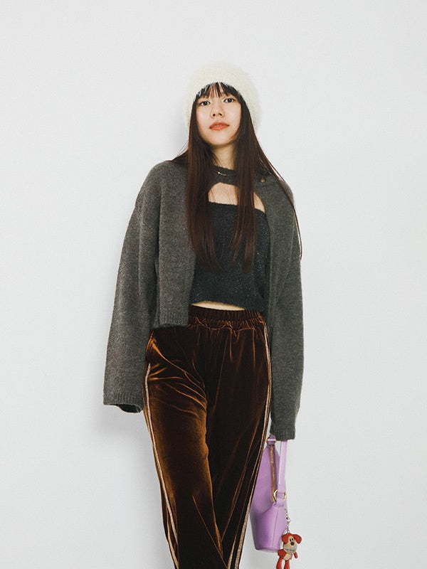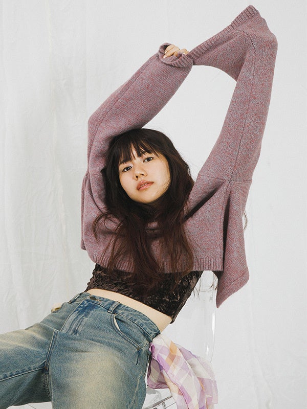 ケープのような少し個性的な前開きデザインのニット。チョーカーイメージのネックデザインに、さらささんこだわりのボタンディテールがポイント。袖口もストレートでルーズなシルエットなので、折り返して着ても可愛くておすすめです。