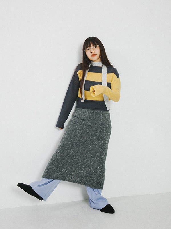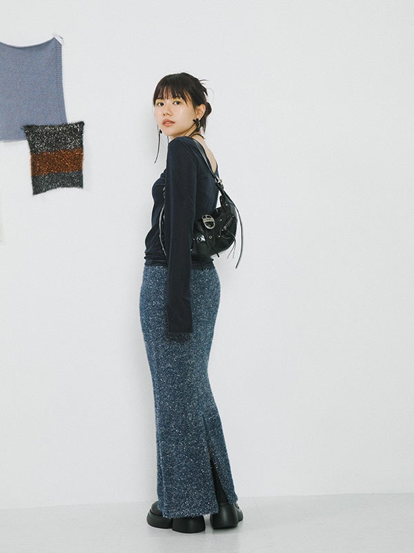 ラメ生地だけどチクチクしない肌あたりの良い素材を使ったニットスカート。タイトシルエットながらしっかり伸びるため、体型問わずに着ていただけます。Sサイズは10cm丈を短くしていて、パンツとレイヤードしても可愛いアイテムです。
