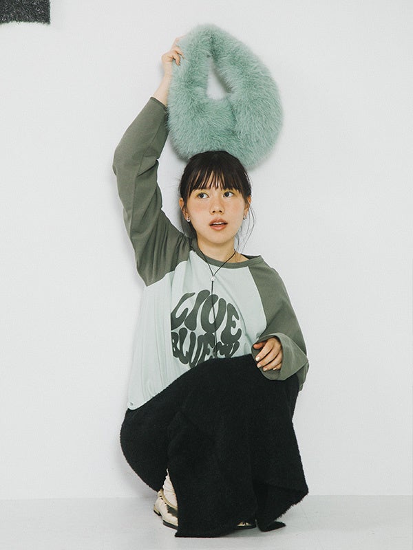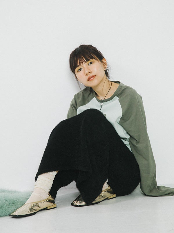 さらささんこだわりの配色に、肩がスッキリ見えるラグランデザインのロングTシャツ。袖口はあえてラフなロック仕立てで、長さもずるっとルーズめに。ロゴ部分のフロッキー加工も可愛いおすすめの一枚です。