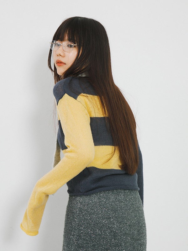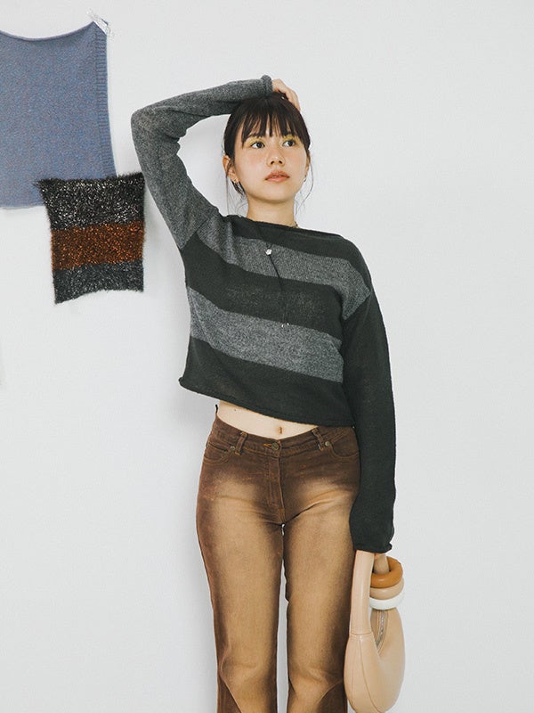 浅めのボートネックで大人っぽいクロップド丈のボーダーニット。裾や袖口、襟のロールデザインや、袖部分も左右配色がポイントに。タートルのインナー合わせでも可愛い万能アイテムです。