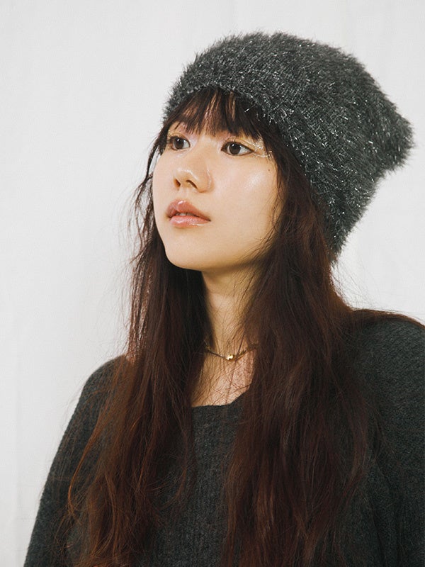 ラメが入ったシャギー生地のビーニー。落ち感が可愛く、ボリュームも出過ぎない、ちょうどいいバランスにこだわったアイテム。ソフトな締まり具合で被り心地もいいのがポイントです。