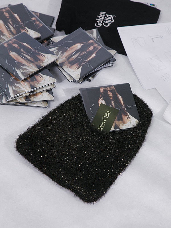 ビーニーと同じラメのシャギー生地を使ったオリジナルトートバック。ニットを着ていても肩にかけられるゆったりとした持ち手。