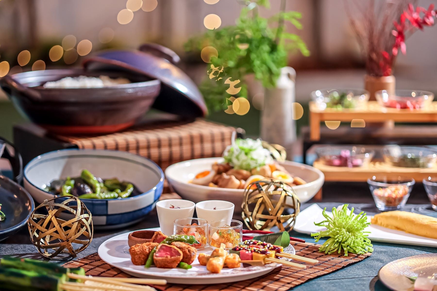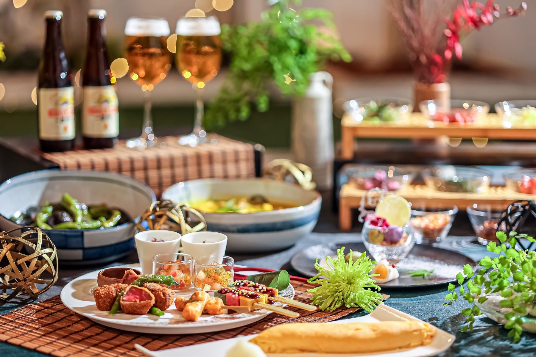 京都の家庭料理をフレンチ出身の結婚式場専属シェフがアレンジして提供するお料理は、目でも舌でも楽しめる6種の京おばんざいワンプレートから始まり、味がしっかり浸み込んだ豚の角煮や茄子のコンソメ煮びたし、暑気払いにぴったりなさっぱりとした鰹のたたきや、フレンチの技法を使って出汁をひいた牛煮込みのカレーうどん、鯛と鶏2種の出汁と和洋8種のトッピングで何度も味の変化が楽しめるお茶漬けなどをご用意。また、京都ならではの枯山水をイメージしたデザートプレートもお楽しみいただけます。ドリンクは、ソフトドリンク、アルコール、スペシャルの3プランからお選びいただけるので、親子三世代や、女子会、会社の納涼会など様々な用途で初夏から晩夏までご利用いただけます。