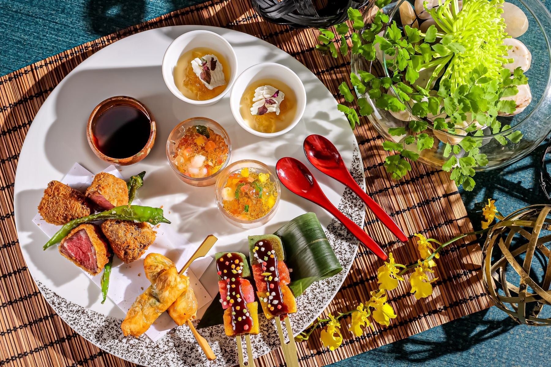 <ファーストプレート>湯葉とモッツァレラチーズ/牛カツ/季節のお野菜/生麩田楽串/小海老と夏野菜のジュレ寄せ/冷製ロワイヤル
