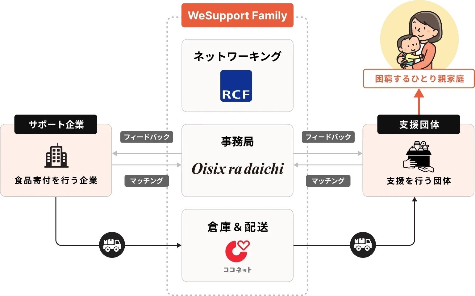 オイシックス・ラ・大地株式会社(本社:東京都品川区、代表取締役 社長:高島 宏平、以下 当社)が、一般社団法人RCF、ココネット株式会社(セイノーグループ)と連携して運営する「WeSupport」(代表:高島 宏平)では、ひとり親世帯を中心とした困窮家庭に向けた食品支援のプロジェクト「WeSupport Family」を行っています。2021年12月の発足以降、活動の規模を拡大しており、食品等の寄付をするサポート企業は79社、支援物資は16億円分(※1)を突破し、支援世帯数は30,273世帯となりました。(2025年5月9日時点)この支援規模は、ひとり親家庭向けの食支援プラットフォームとして国内最大級(※2)です。「WeSupport Family」では、今後もサポート企業などの支援を受けながら、ひとり親世帯を支援するフードパントリーや子ども食堂などへの食品支援を継続、拡大してまいります。