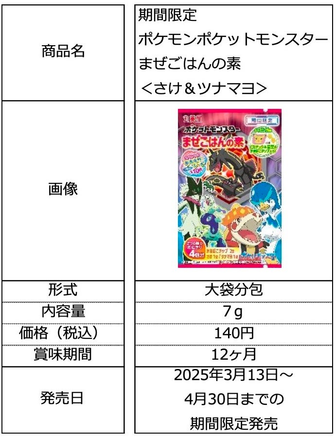丸美屋食品工業株式会社(本社:東京都杉並区、社長:阿部豊太郎)は、幅広い世代から人気の「ポケットモンスター」(以下「ポケモン」)を採用した「期間限定 ポケットモンスターまぜごはんの素<さけ&ツナマヨ>」を2025年3月13日(木)から4月30日(水)までの期間限定で発売いたします。
