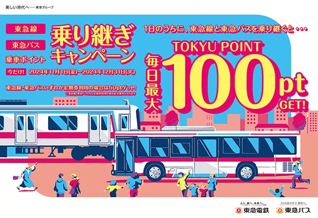 東急線と東急バスの両方を同日にご利用いただくと、最大100ポイントのTOKYU POINTを加算する「乗り継ぎキャンペーン」を2024年11月1日(金)から2024年12月31日(火)の期間限定で実施