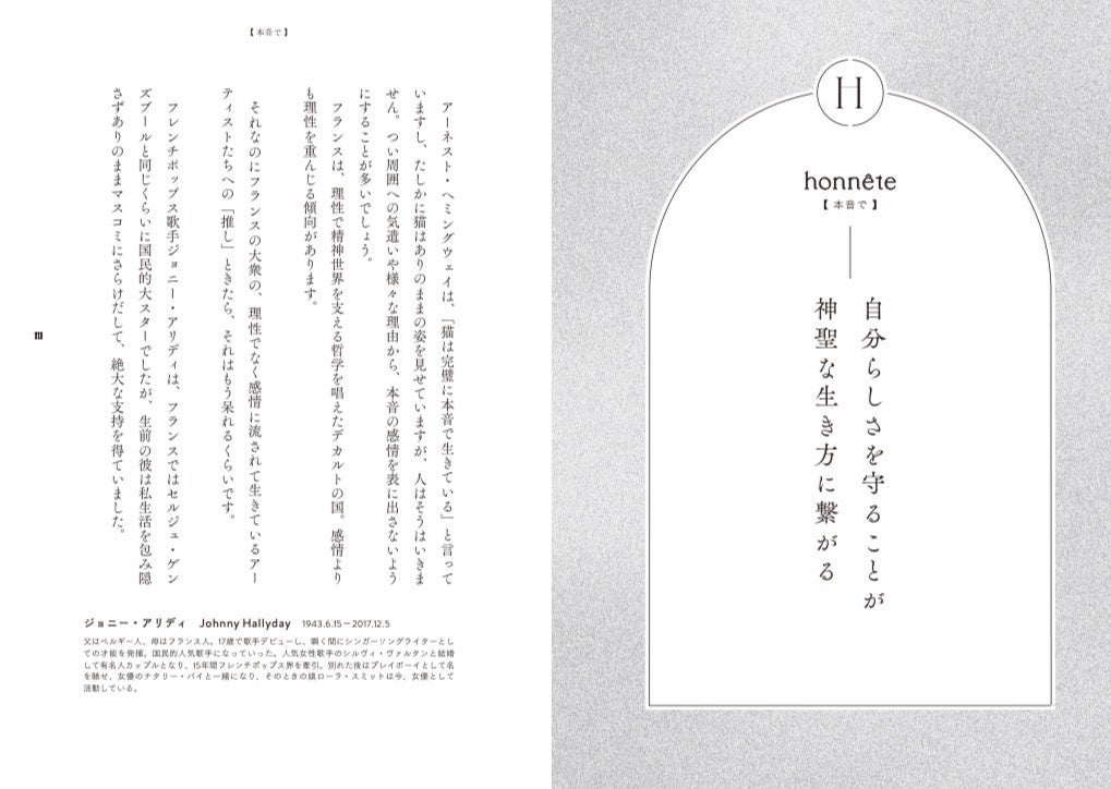 <A>accueille【おもてなし】âge【年齢】amour【愛】<B>birkin【バーキン】bise【挨拶のキス】bonjour【ボンジュール】<C>cadeaux【贈りもの】café【カフェ】 carré【スカーフ】confort【心地よさ】coup de foudr【一目惚れ】<D>dandysme【女のダンディズム】<E>élégance 【エレガンス】<F>flatter【お世辞】fleur【花】<G>galanterie【女性へのマナー】gants【手袋】gâteau【甘いお菓子】<H>histoire【歴史】 honnête【本音で】<I>internet【インターネット】<J>joie【よろこび】<K>kawaii 【カワイイ】 <L>livre【本】logique【理屈好き】<M>maison【家】materiel 【素材 】 <N>noblesse oblige【持てるものの義務】 noël【クリスマス】non!【ノン!】 nouveau【新しい】 <O>obligation【義務】<P>parfum 【 香水 】 personnalité 【個性】<Q>qualification【資格や学歴】<R>robe【ドレス】<S>se déguiser【変装】<T>T-shirt【T シャツ】<U>une amie【女友達】unique【ユニーク】<V>vacances【ヴァカンス】<W>weekend【週末】<X>x【超エリート】xenophobe【外国人嫌い】<Y>yeux【目】<Z>zen【禅スタイル】