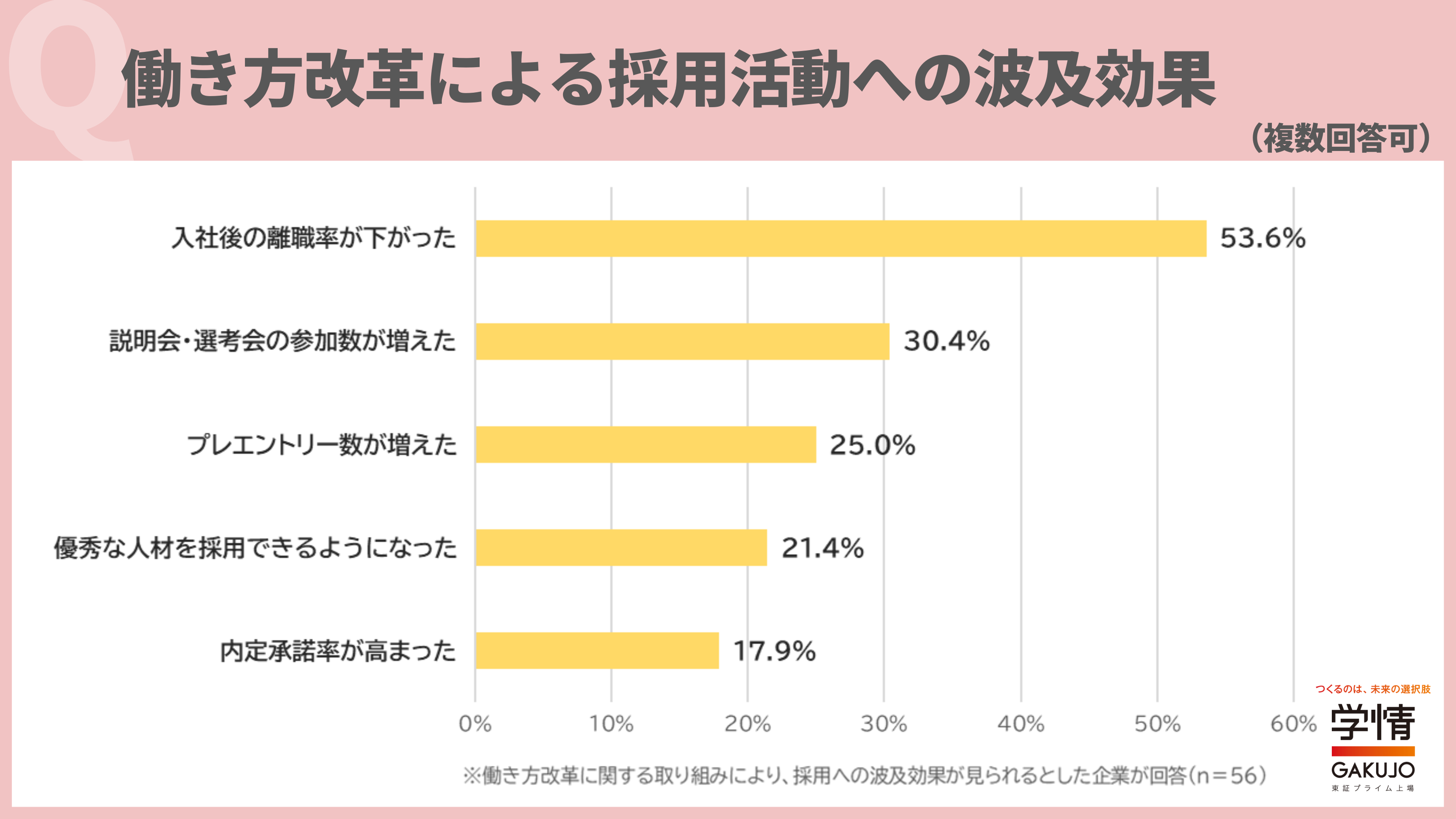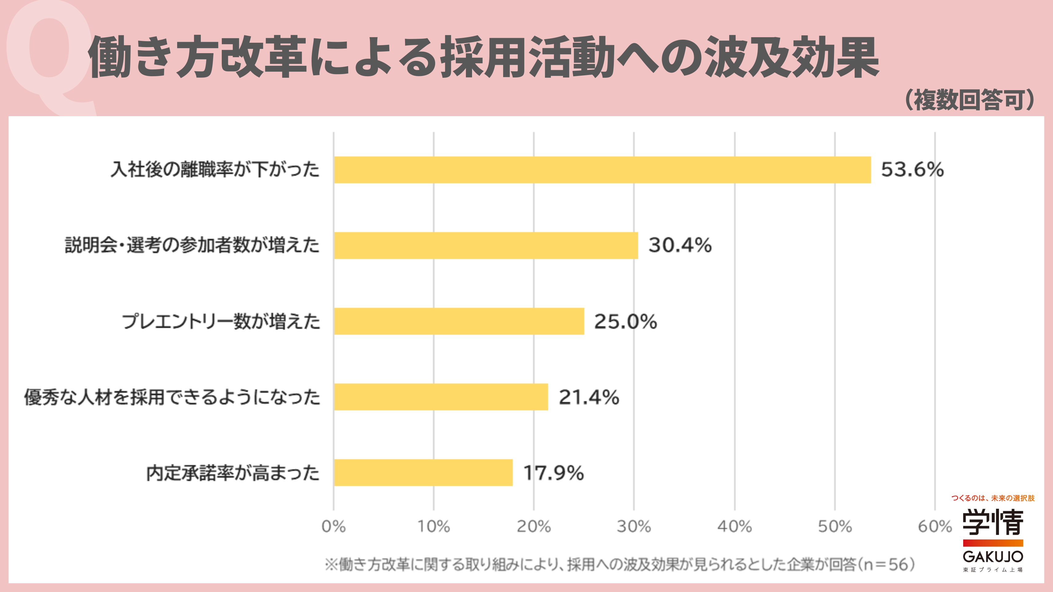 「働き方改革」による採用活動への波及効果は、「入社後の離職率が下がった」が53.6%で最多。次いで、「説明会・選考の参加者数が増えた」30.4%、「プレエントリー数が増えた」25.0%が続きました。