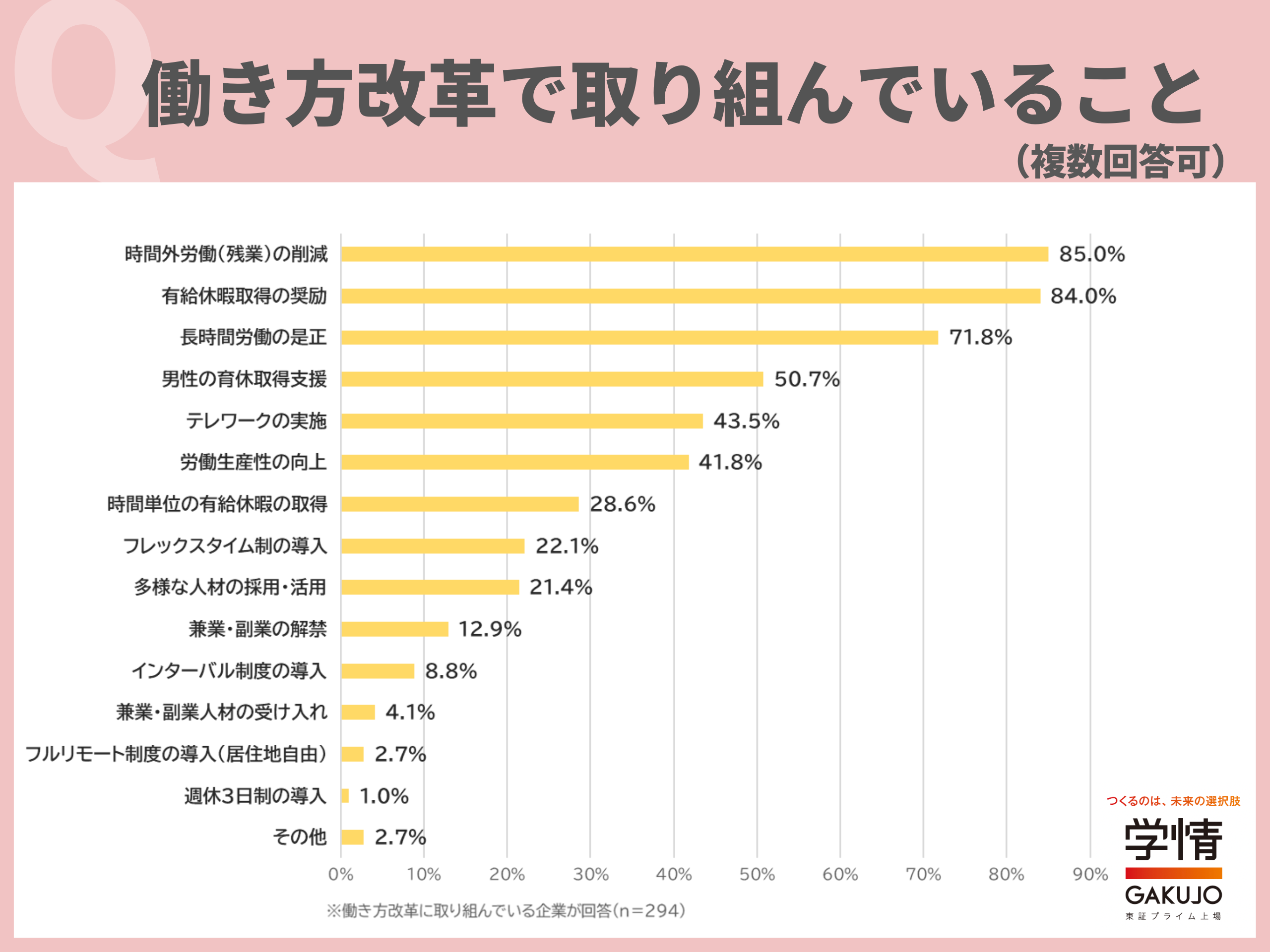 「働き方改革」で取り組んでいることは、「時間外労働(残業)の削減」が85.0%で最多。次いで、「有給休暇取得の奨励」84.0%、「長時間労働の是正」71.8%、「男性の育休取得支援」50.7%が続きました。