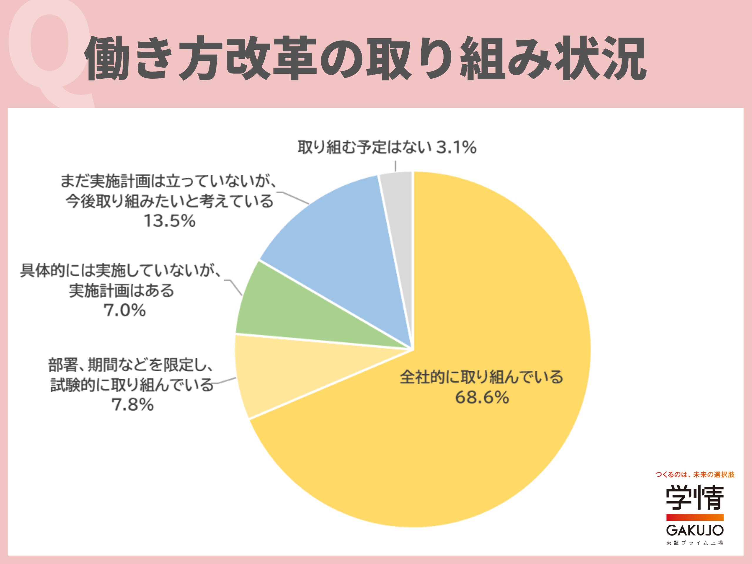働き方改革について、「全社的に取り組んでいる」と回答した企業が68.6%に上りました。約7割の企業が、働く環境の改善に取り組んでいることが分かります。