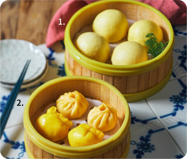 2.かぼちゃとエビの蒸し餃子(5個入り)951円 カニとコーンの水晶包(5個入り)951円
