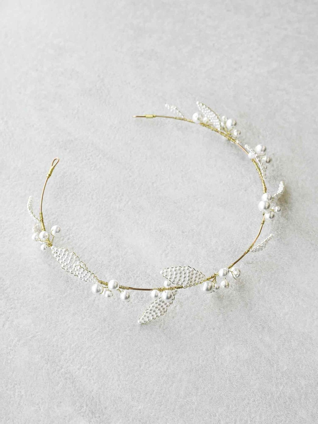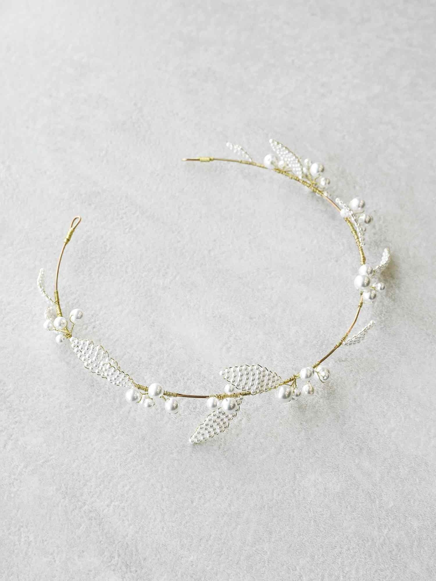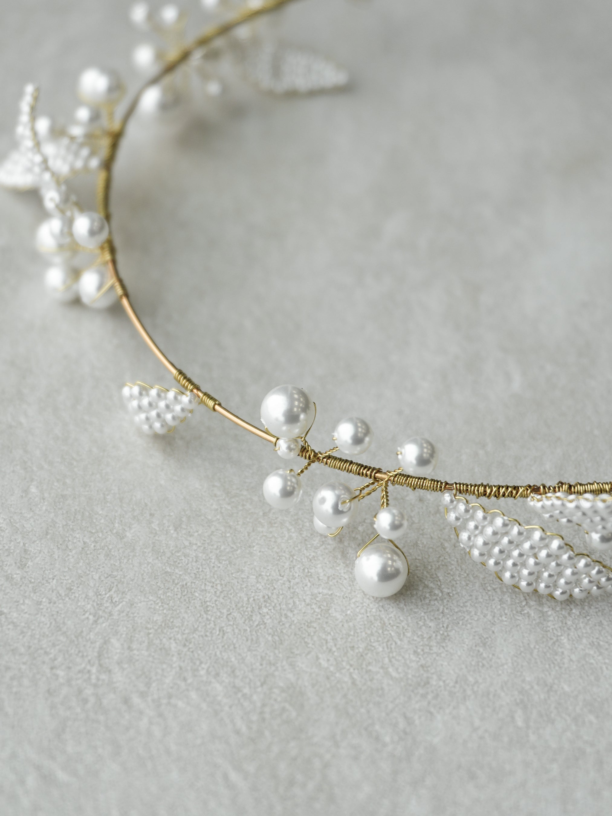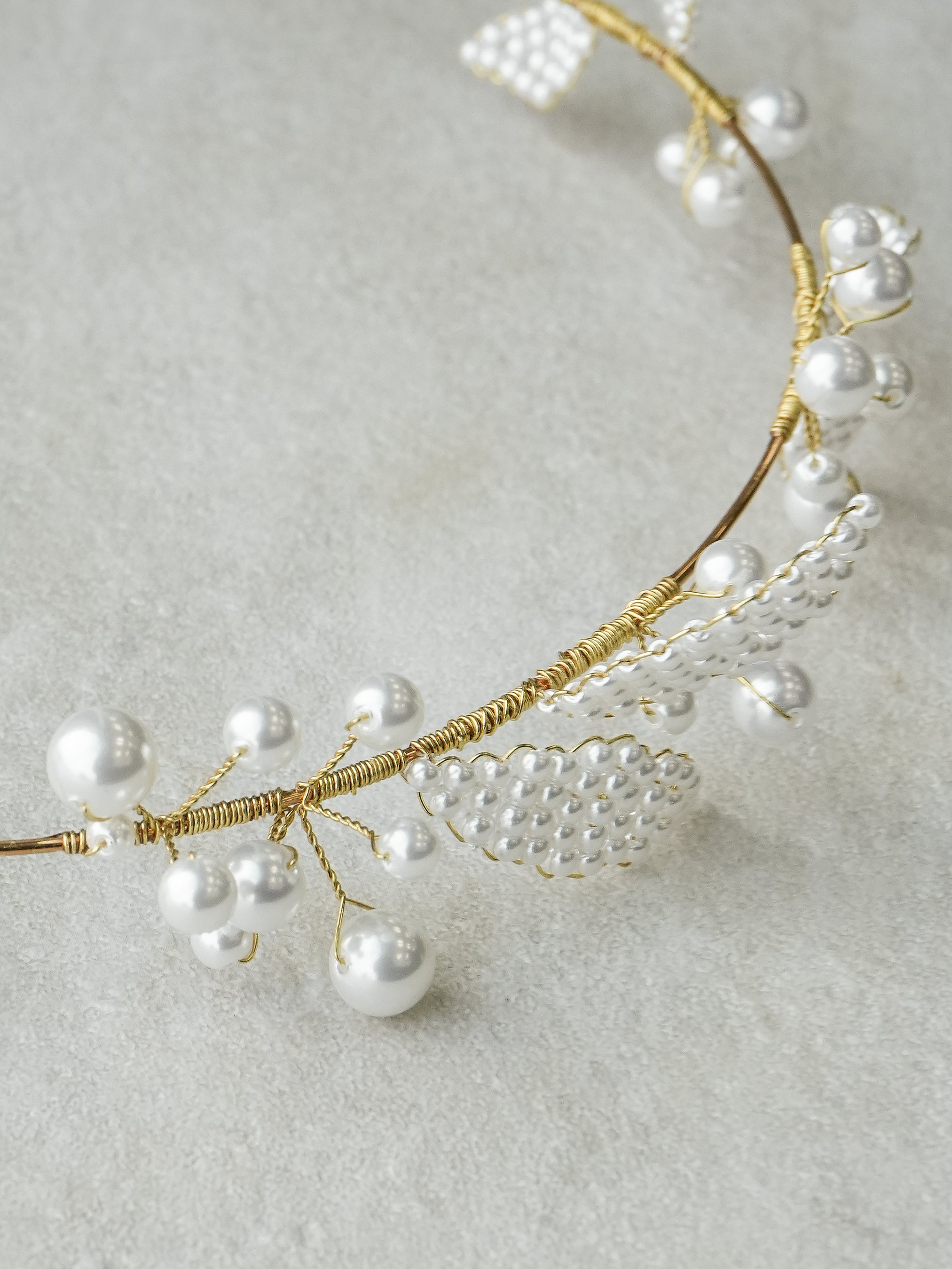 1粒1粒パールを編み込んで製作した、繊細なヘッドドレス。柔らかなパールの輝きが上品に映え、存在感がありながらも主張しすぎない、洗練されたナチュラルな雰囲気に仕上げました。花嫁さまのスタイルにそっと寄り添う、やわらかな印象のヘッドドレスです。