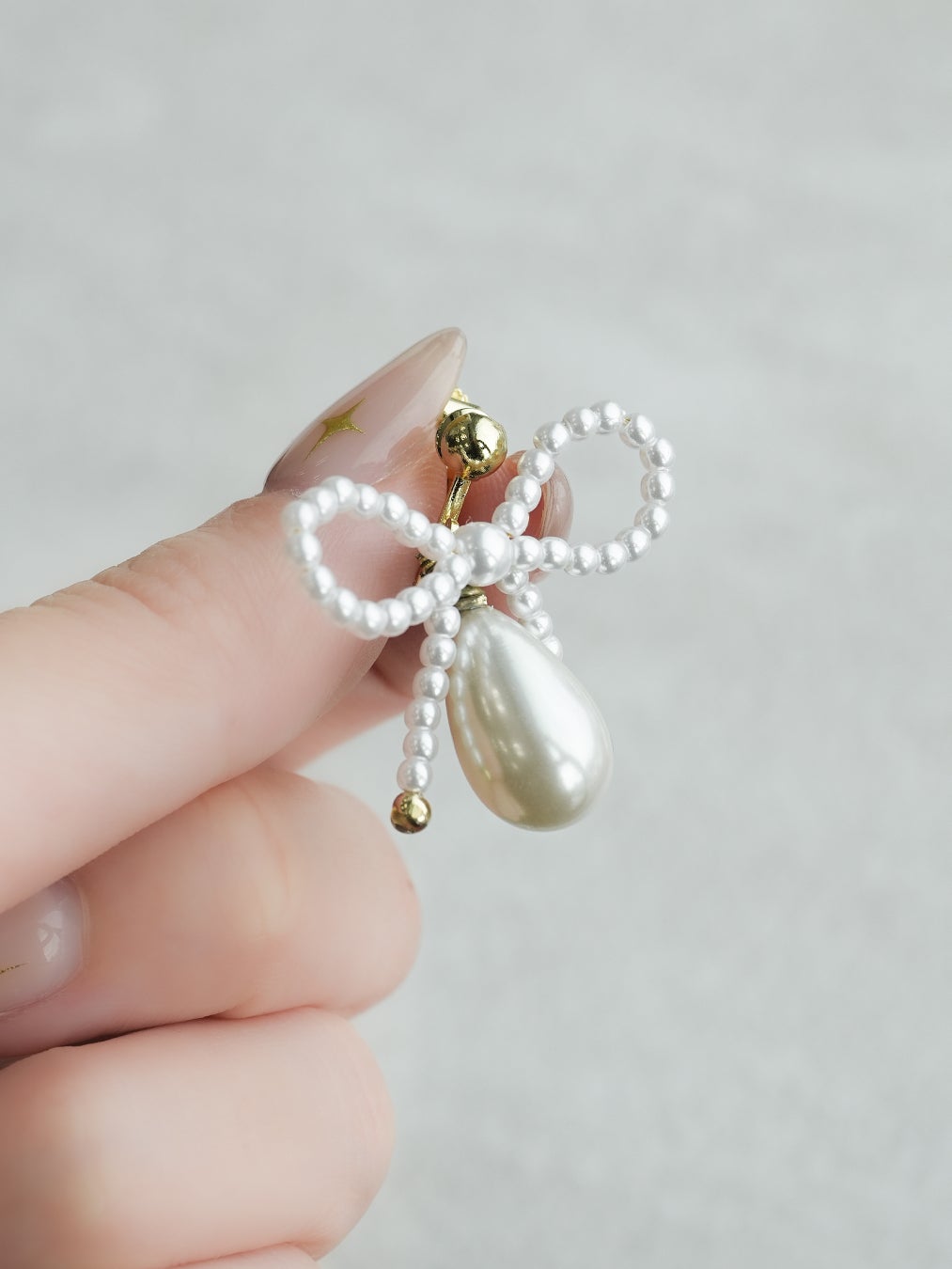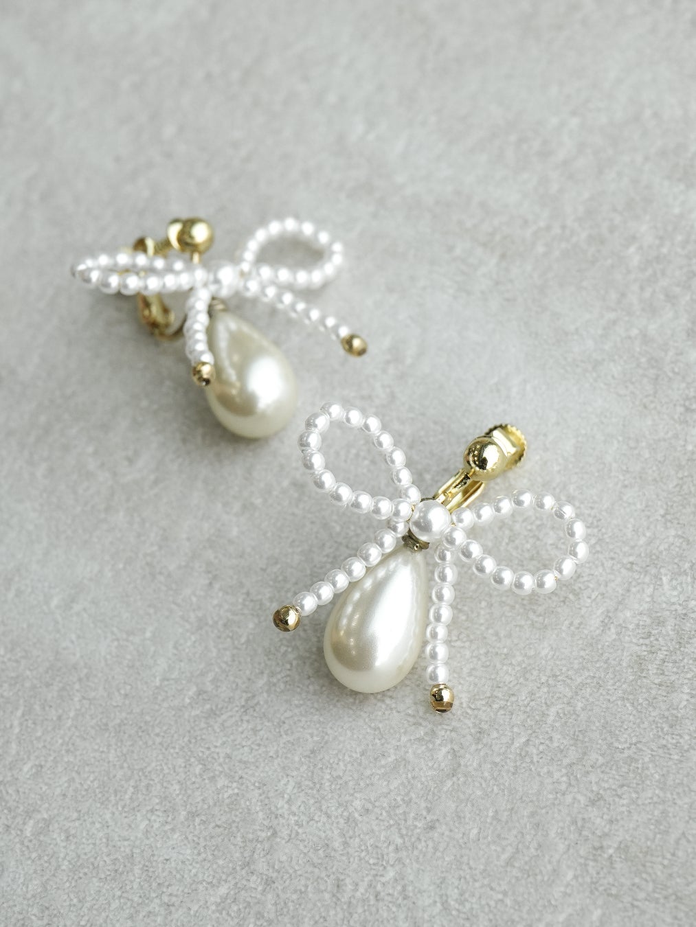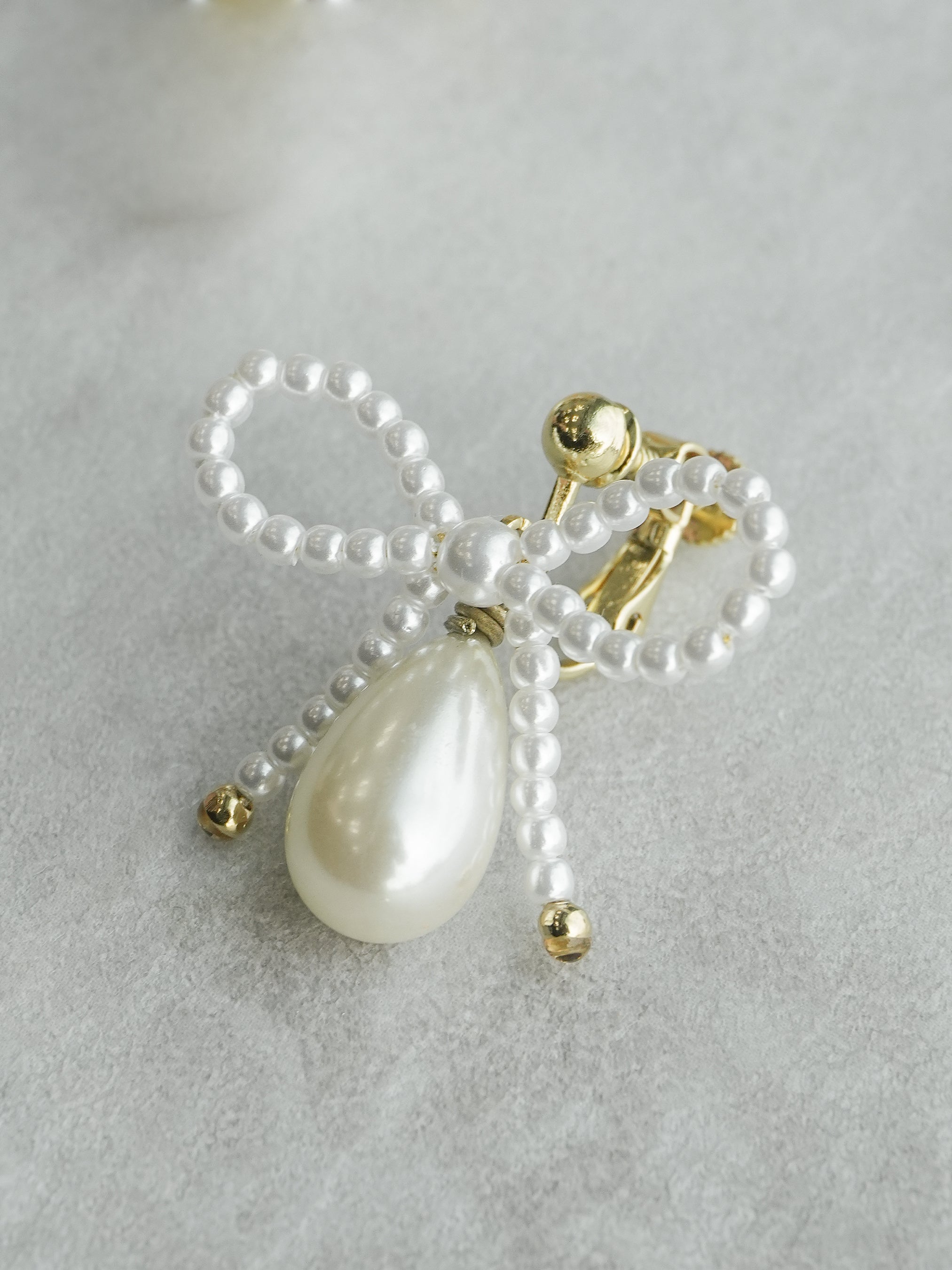 パールリボンに、しずく型のガラスパールを合わせた耳飾り。小粒パールで形作られたリボンと、つややかなドロップパールが上品に揺れ、パールならではの可愛さと、ほどよい重厚感を感じられるデザインです。普段使いはもちろん、特別な日のコーデにもそっと華を添えてくれます。