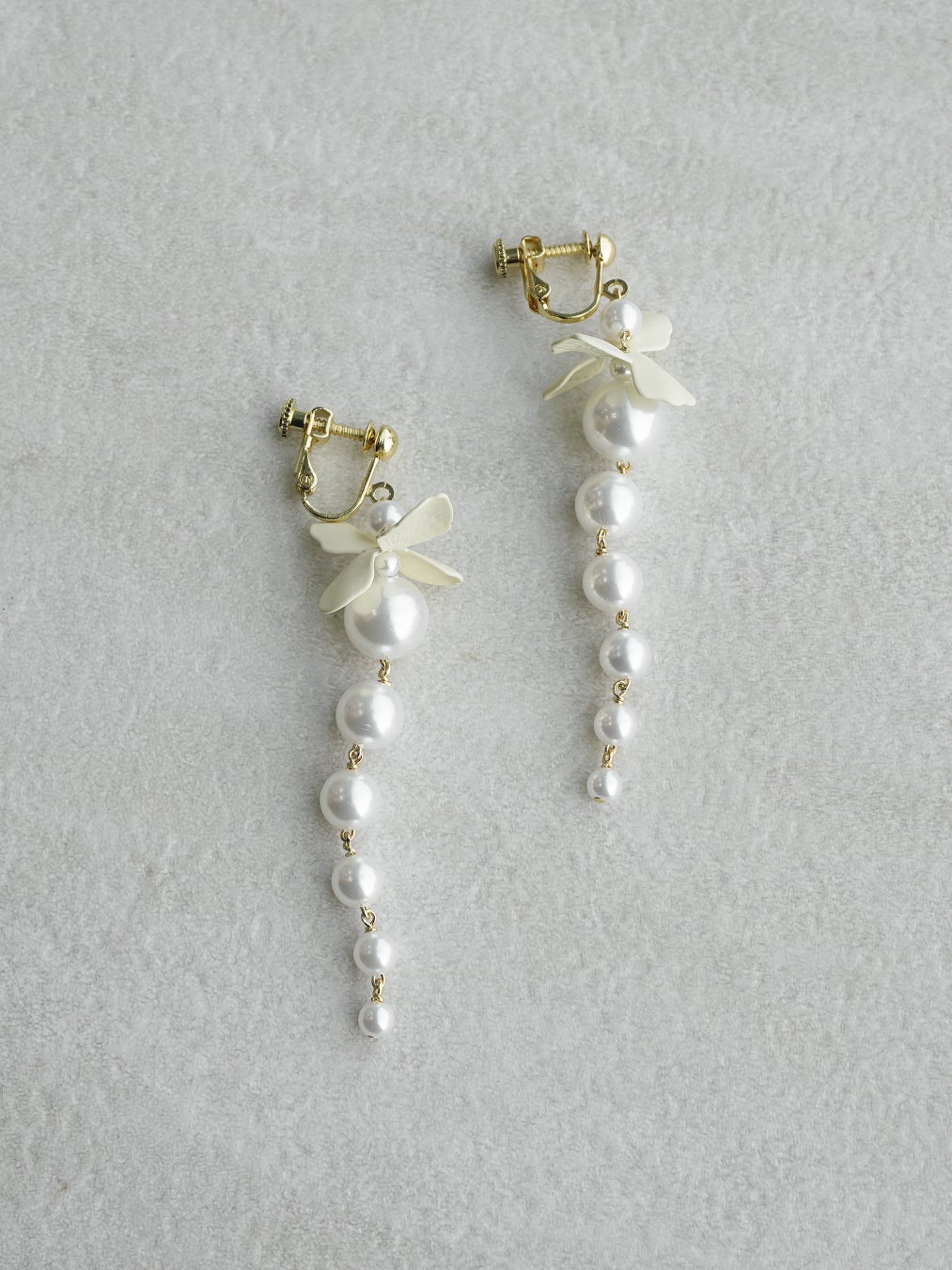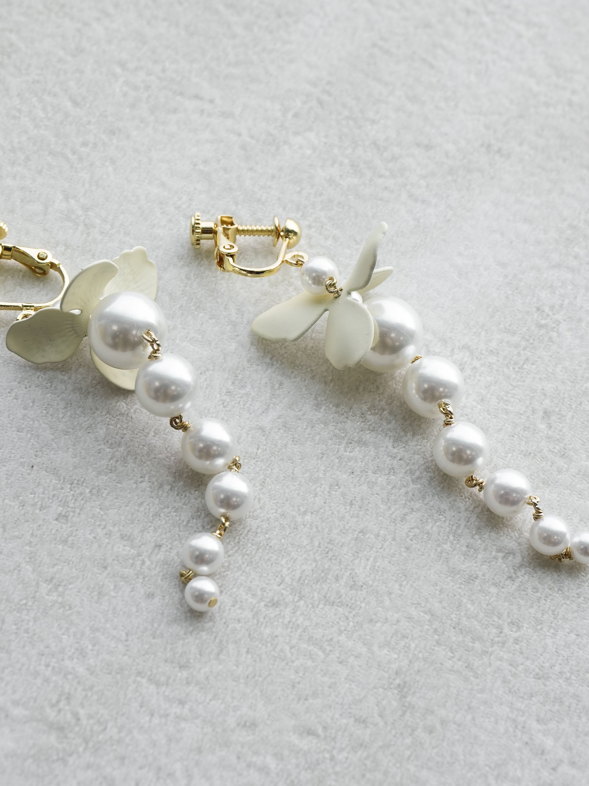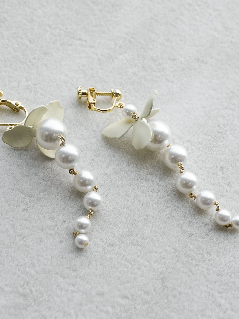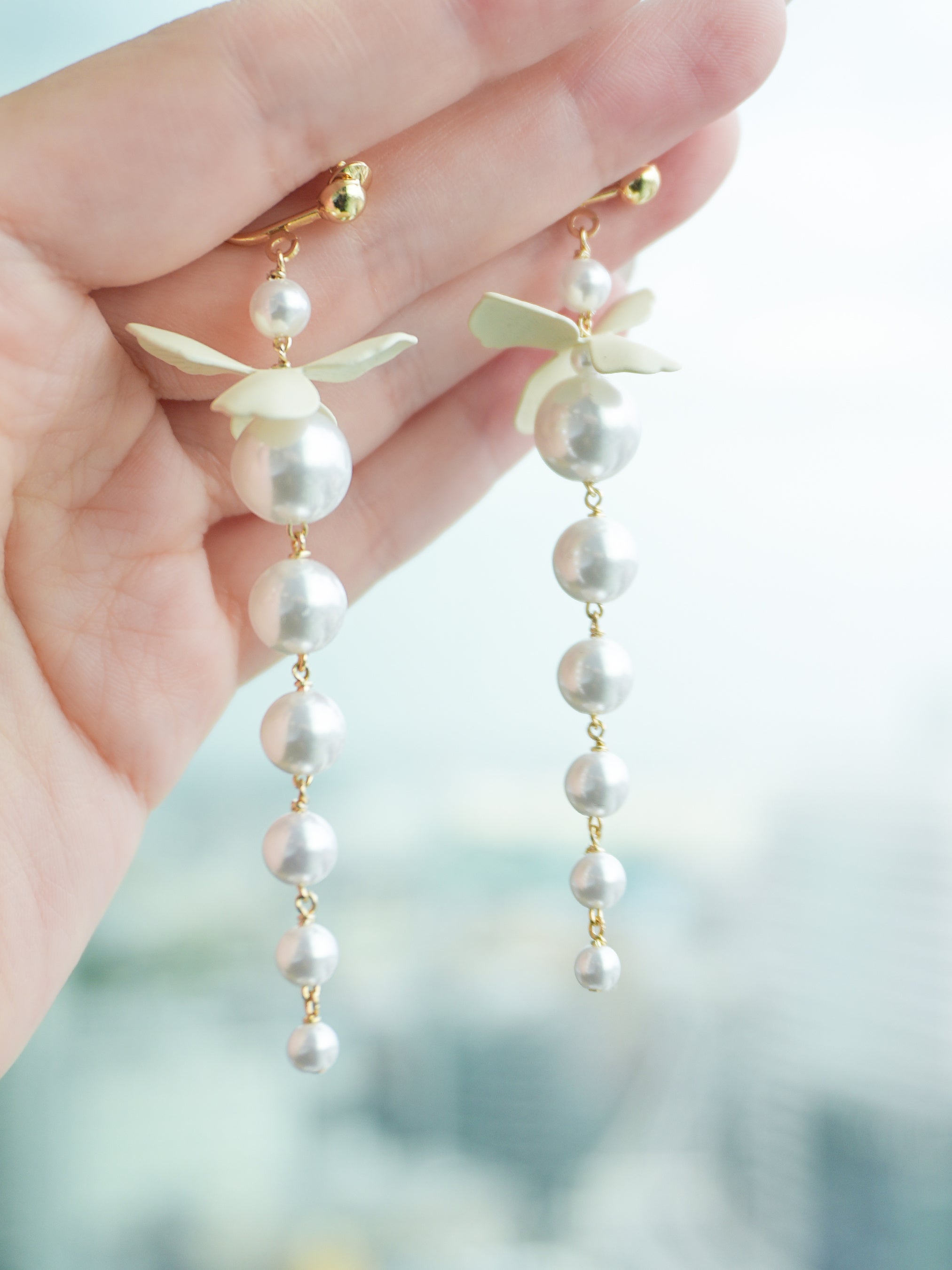 ホワイトフラワーとパールを使用した耳飾り。長すぎず短すぎない縦長のシルエットをイメージし、可憐さと上品さを兼ね備えたモダンパールアクセサリーです。連なるパールが軽やかに揺れ、柔らかなフラワーモチーフがやさしい印象を添えます。特別な日にも、日常の装いにもそっと華やぎをプラスしてくれるデザインです。