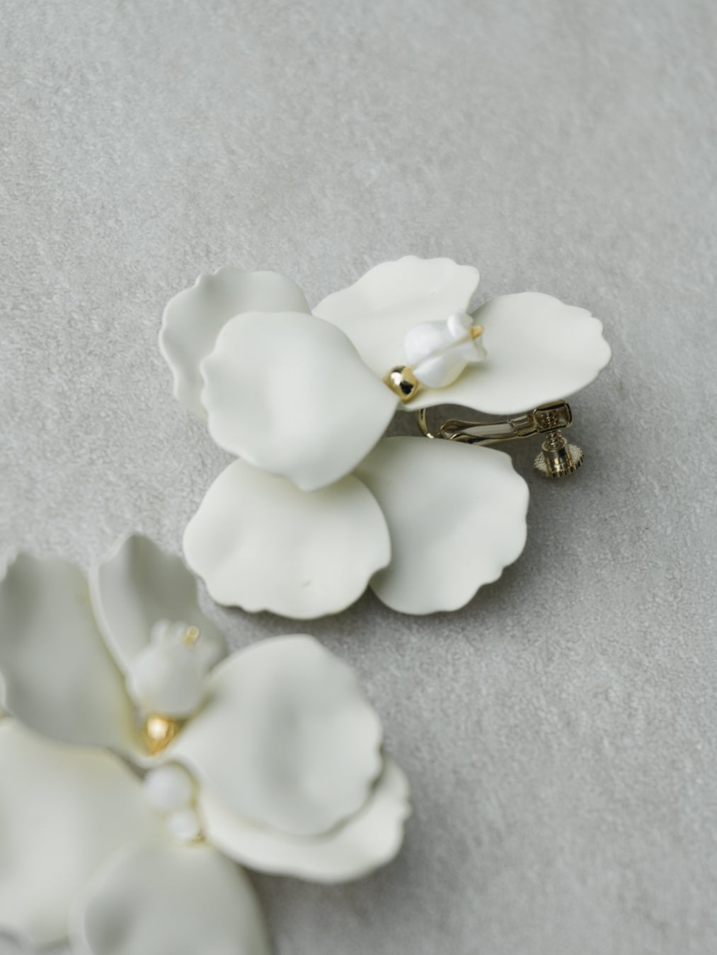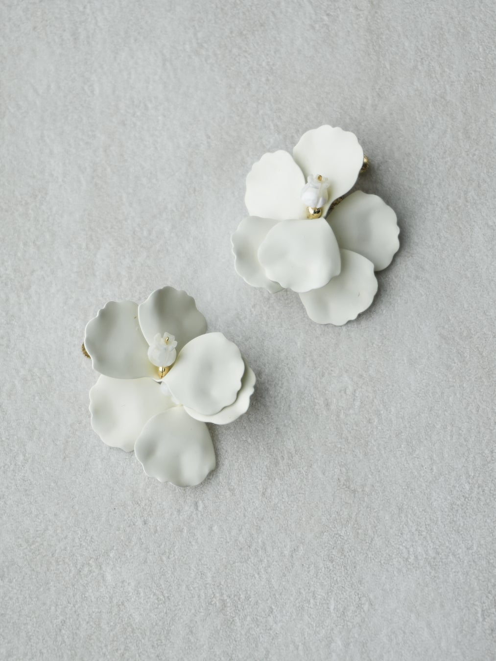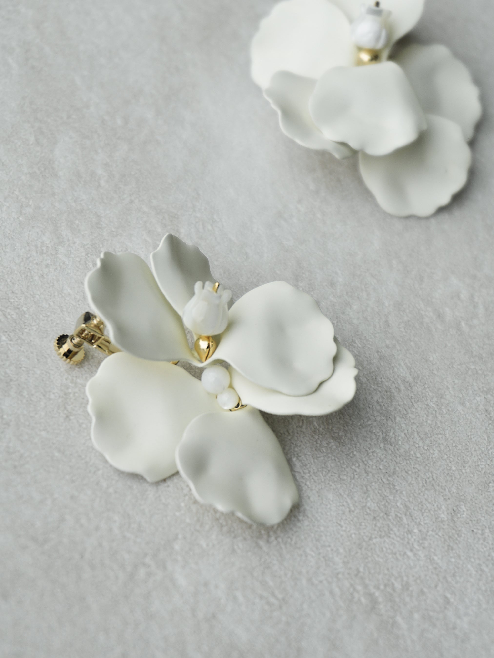 emmaオリジナルのホワイトフラワーを使用した耳飾り。ボリュームがありながらもシンプルでemmaらしいデザインに仕上げました。お花の中心には、すずらんのシェルビーズを添えて上品なアクセントをプラス。大振りなデザインですが、大人っぽさの中に可愛さも感じられるアクセサリーです。