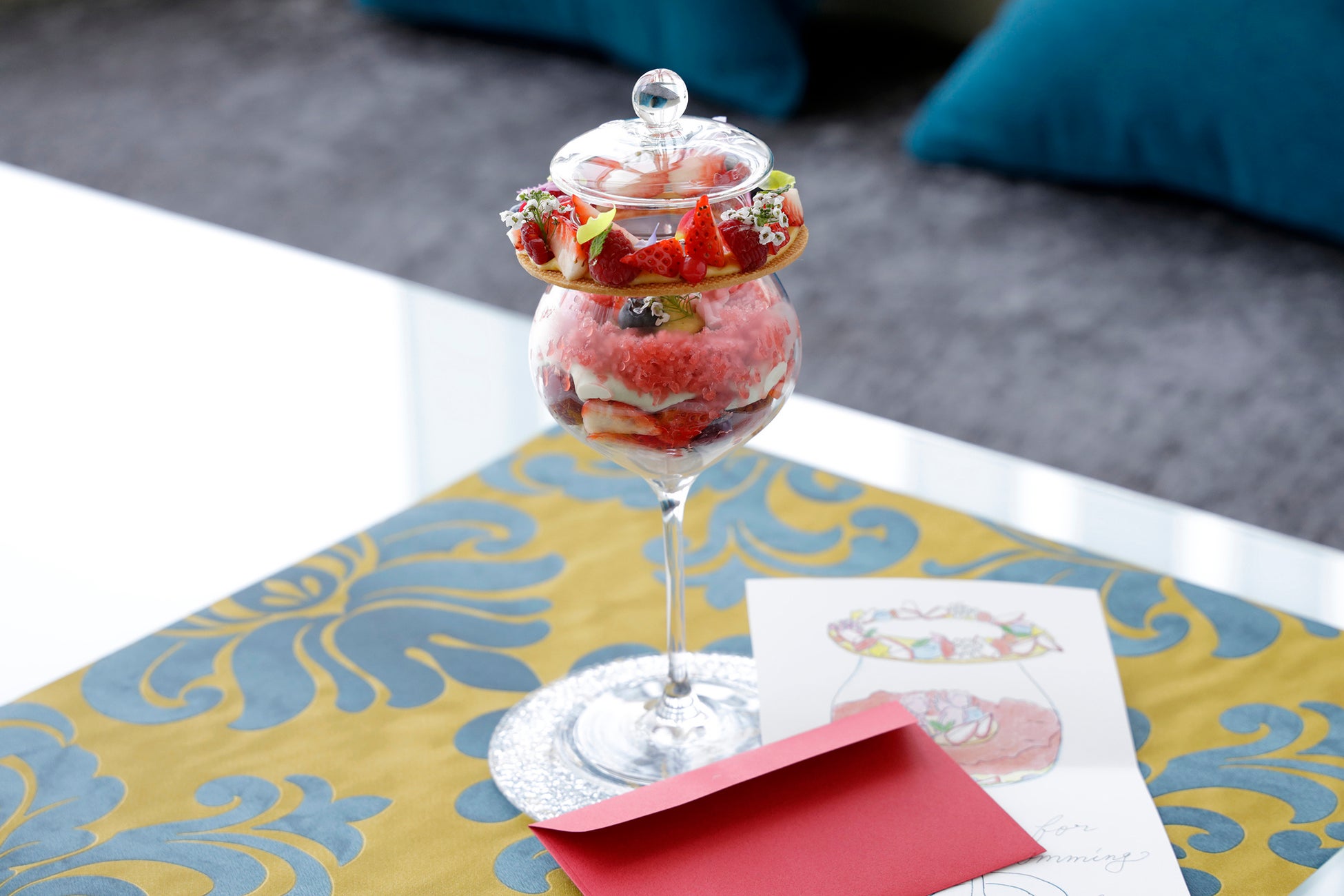 ヨハネス・フェルメールの《窓辺で手紙を読む女》の隠されていたキューピッドが姿を現したエピソードとリンクしたグラスデザートです。グラスの中に閉じ込めた香るスモークとともにキューピッドが現れます。夏イチゴをたっぷりと使用し、グラニテやココナッツのパンナコッタが爽やかさを演出します。