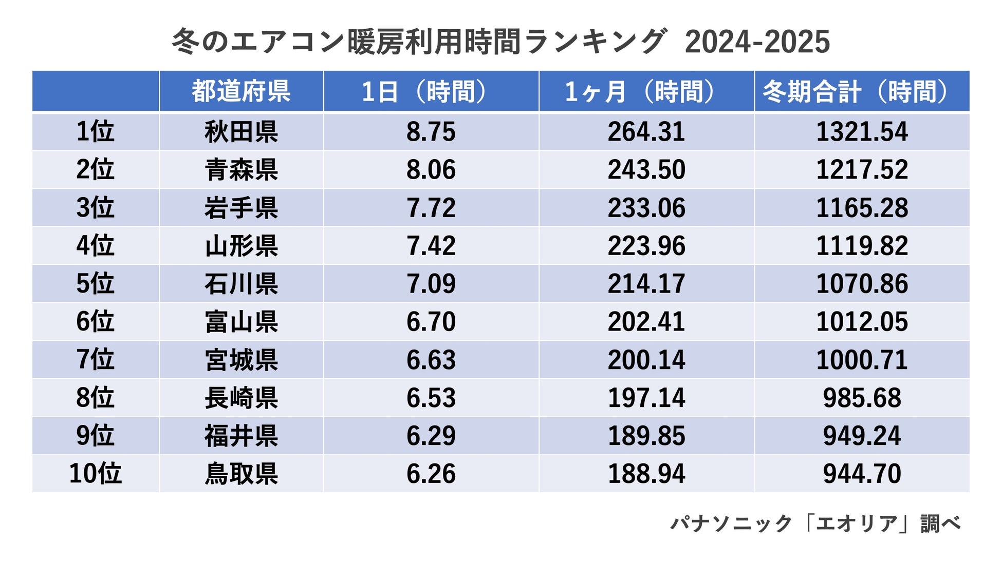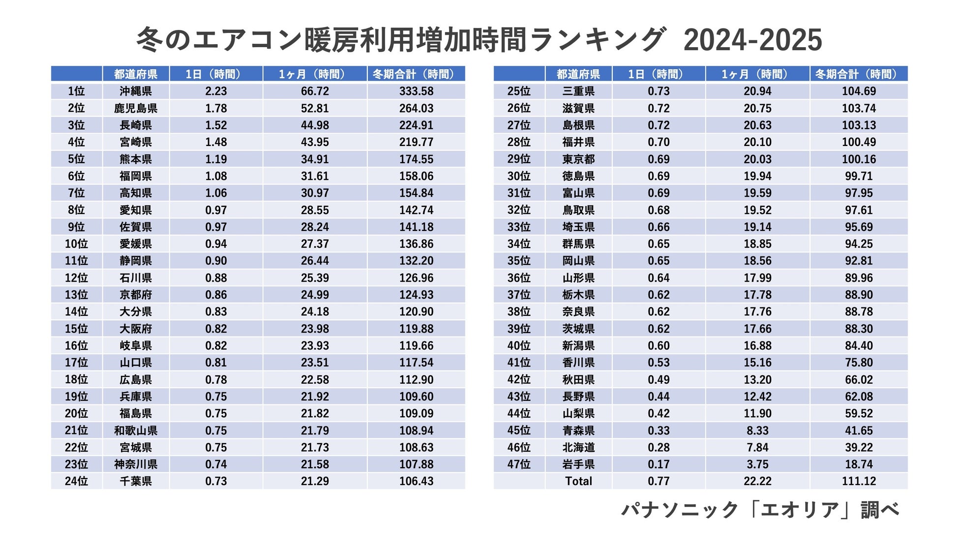 パナソニックは、エオリア アプリに接続したエオリアユーザーの利用データをもとに、今冬(2024年10月〜2025年2月)のエアコン暖房利用時間と利用増加時間(昨年比)を、それぞれ算出しました。