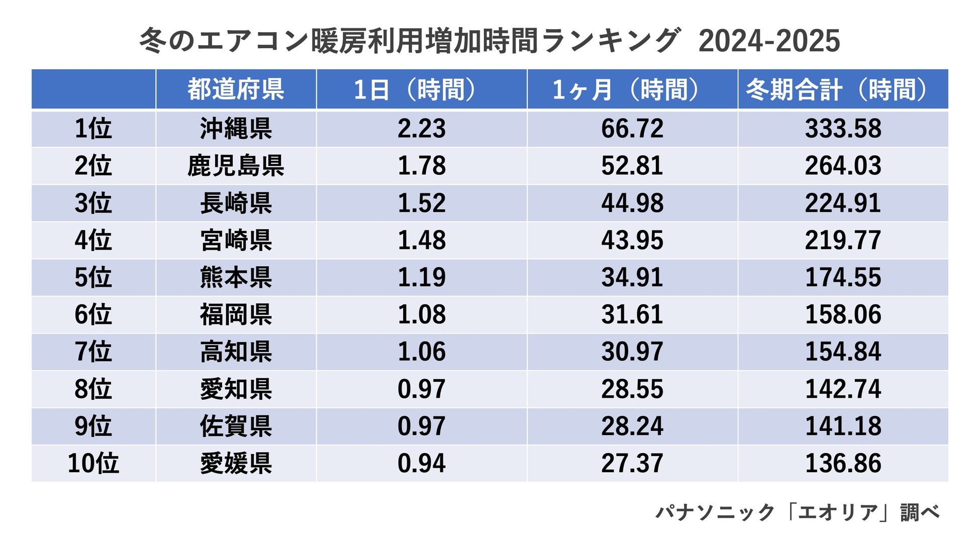 暖冬傾向だった昨年同期間と比較すると、今冬は47都道府県すべてでエアコン暖房利用時間が増加し、冬期合計で100時間以上の増加となりました。全国で最もエアコン暖房利用時間が増加したのは沖縄県で、1日平均2.23時間、冬期合計で333.58時間の増加に。2位以降は、鹿児島県・長崎県・宮崎県・熊本県・福岡県と九州地方のエリアが6位まで続きます。気象庁の冬(2024年12月~2025年2月)の天候まとめによると、この冬の平均気温は沖縄・奄美ではかなり低く、西日本も低い観測となっており、同地域は冬のエアコン暖房利用増加時間ランキングでも上位にランクインしていることがわかります。