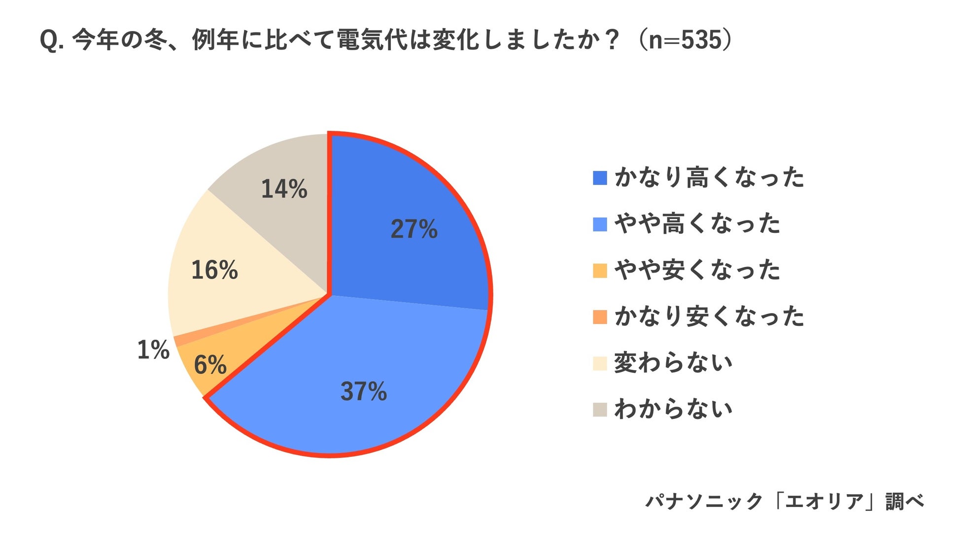 パナソニック エオリアデータから、昨年よりエアコン暖房の利用時間が増えたことが明らかになった今年の冬。比例して電気代も増加したことがアンケート調査によりわかりました。「今年の冬、例年に比べて電気代は変化しましたか?」という質問では、「かなり高くなった」27%、「やや高くなった」37%と64%の方が電気代が増加したと回答しています。