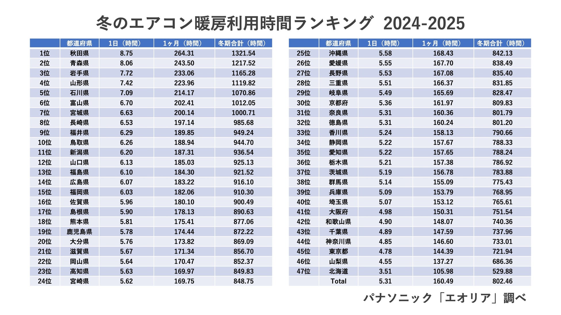 ■冬のエアコン暖房利用時間ランキング 2024-2025