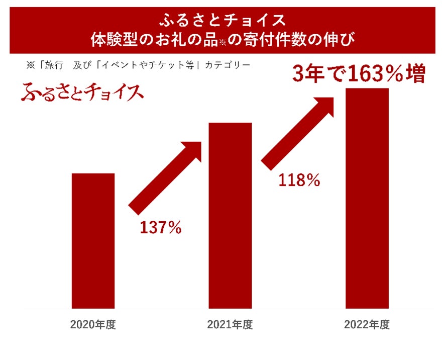 ふるさとチョイスにおける「旅行」及び「イベント・チケット等」カテゴリーの寄付件数は2020年度から2022年度の3年で163%増加しており、今後ますますの増加が期待されているカテゴリーです。