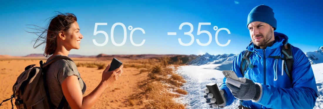 本製品は-35~50℃※の幅広い温度環境下で使用が可能です。マイナス環境下でも使用できるため、スキー場などの雪山といった過酷な環境でも機器を充電することができます。