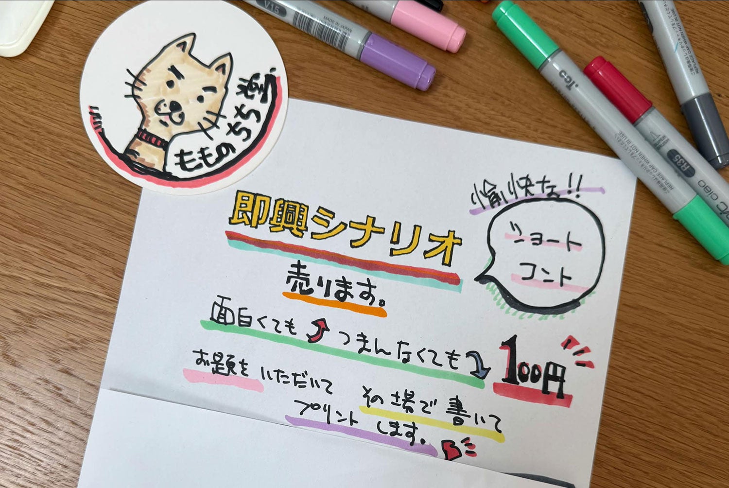 毎回行列必須のコンテンツ。現役で活躍されているシナリオライター横谷 昌宏 氏が、もらったお題でショートコントの即興シナリオを制作します。売り切れ御免の人気ブースです。
