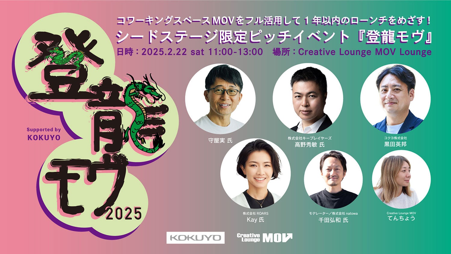 登龍門ならぬ『登龍モヴ』は、MOVが取り組むスタートアップ支援プログラム。優勝者を1年かけて応援していきます。シードステージに限定し、5組(予定)のスタートアップが最終ピッチに挑戦します。熱い気迫を、ぜひ見届けてください。