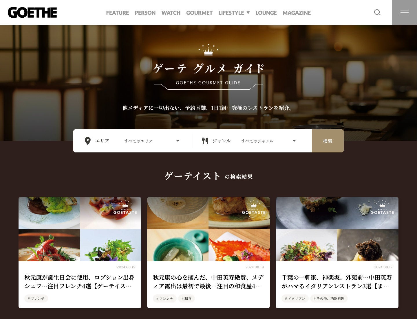 仕事に遊びに一切妥協できない男たちが、人生を謳歌するためのライフスタイル誌『ゲーテ』の公式サイト「ゲーテウェブ」にレストラン検索機能の新サービスが登場した。