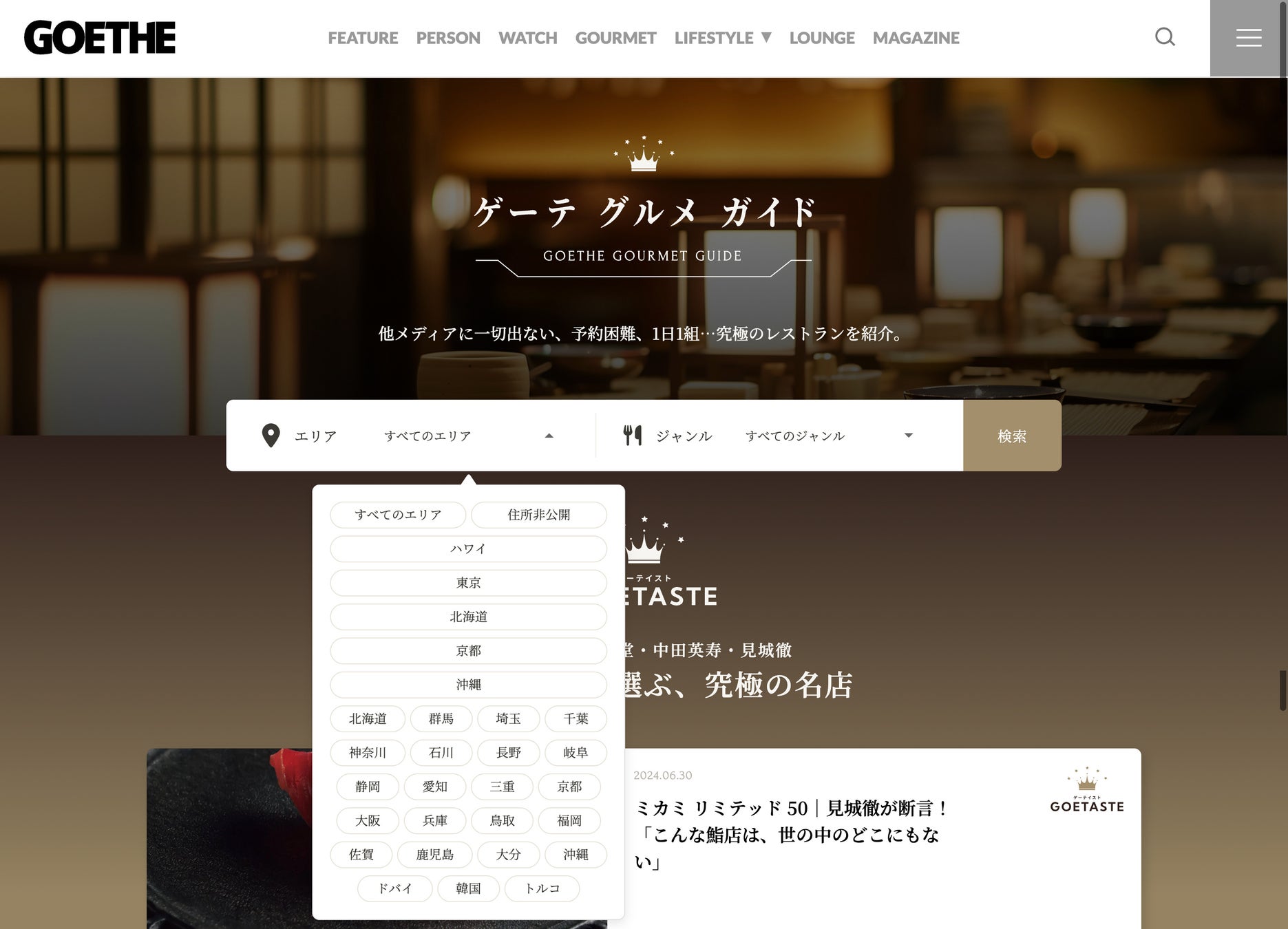 メディア初掲載、会員制、紹介性、1日1組…名店中の名店が検索可能。究極のレストラン検索システム「ゲーテ グルメ ガイド」が登場
