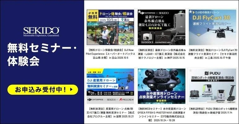セキドでは、より多くの方にドローンを使った撮影や業務効率の改善を実現していただくため、ドローンや関連ソリューションをご紹介する無料セミナーやイベントを定期的に開催しております。今後もオンラインや全国各地での開催を予定しておりますので、ご興味をお持ちのイベントにはぜひお気軽にご参加ください。