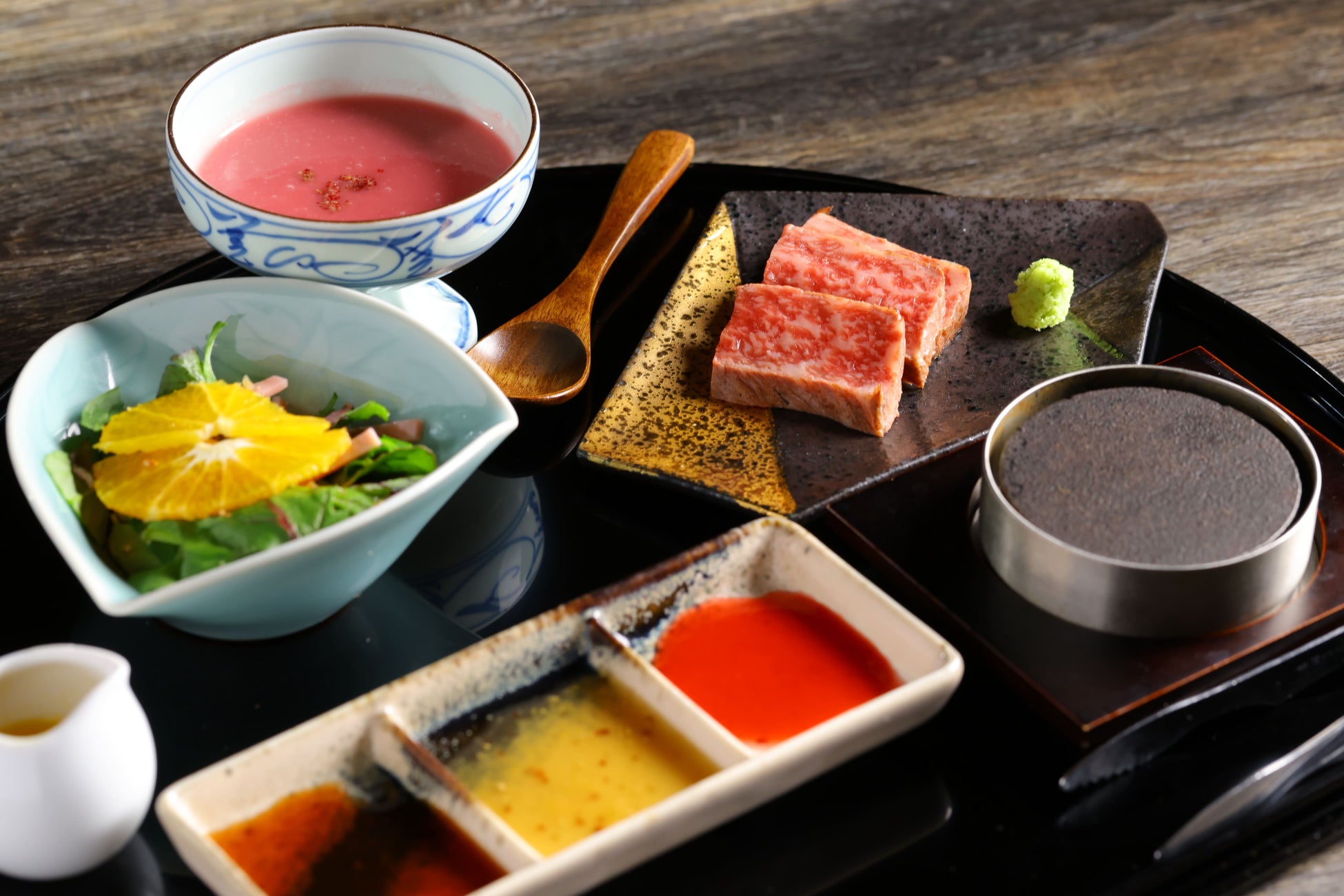 3種ソース+わさびでいただく「国産牛肉サーロインステーキ」