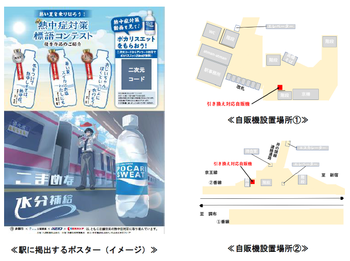 本キャンペーンでは、鉄道利用における駅での待ち時間・移動時間を活用した取り組みとして、京王線・井の頭線をご利用のお客さま向けに各駅に掲出するポスターを二次元コードで読み取った後、熱中症対策に関する動画を視聴しアンケートに回答いただくと明大前駅に設置する大塚製薬の自動販売機でポカリスエットを1本プレゼントします。