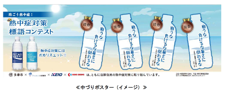 また、当社および株式会社京王ストア(本社:東京都多摩市、代表取締役社長:川田 裕史、以下「京王ストア」)協力のもと、大塚製薬および多摩市教育委員会が、多摩市在籍の小・中学生向けに開催した「熱中症対策標語コンテスト」で入賞した30作品を京王線の中づりに掲載する「熱中症対策標語トレイン」を期間限定で運行します。これは、東京都内の自治体では初めての試みであり、また、電車等の公共交通機関と協力した取り組みは全国で初めての試みとなります。