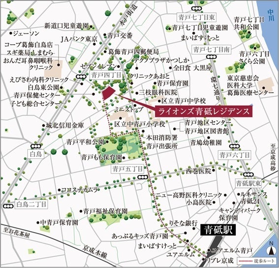 最寄りの「青砥」駅からは、京成押上線を利用することで、都営浅草線「日本橋」駅や京浜急行線「品川」駅などの都心主要駅に直通でアクセスできます。また、物件は「青砥」駅から並木道沿いに徒歩12分と静かな住環境に位置し、徒歩5分圏内に小中学校や公園、スーパーなどがあります。医療施設や図書館、保健センターなどの公共施設も徒歩圏にあり、多様な世代が快適に暮らせる環境です。