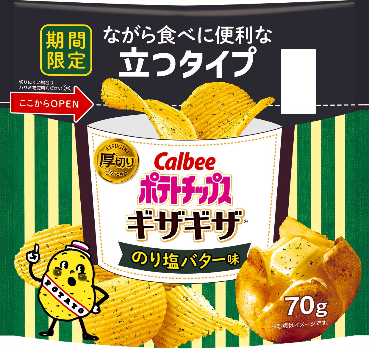 袋が自立する包装形態の「ギザギザ®」が初登場!バターのコクで青のりと焼きのりの風味を引き立てた『ポテトチップスギザギザ® のり塩バター味』