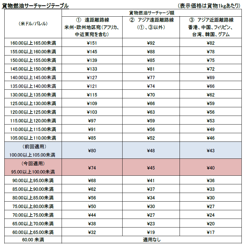 JALは日本発国際貨物燃油サーチャージの改定時期を年12回(毎月)としており、また、各月の貨物燃油サーチャージ額は「シンガポールで取り引きされるジェット燃油(ケロシン)価格の前々月の平均値」を燃油指標価格として、2024年4月より導入した以下テーブルに従いサーチャージ額を決定します。