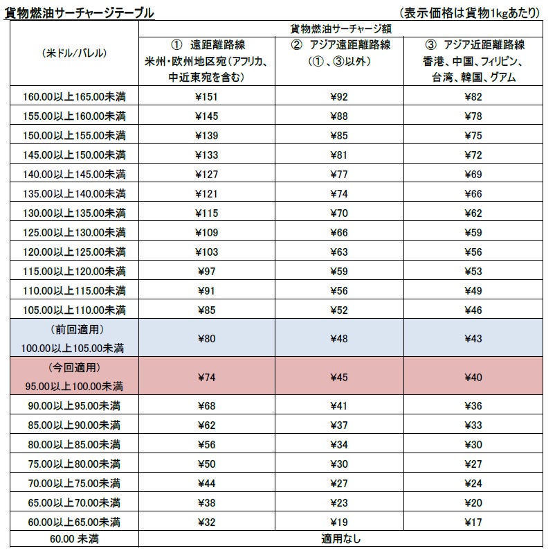 JALは、2024年7月1日から適用となる日本発国際貨物燃油サーチャージを国土交通省へ申請しました。基準となる2024年5月のジェット燃料の平均価格が1バレル当たり95.58米ドルであったことから、燃油指標価格を「95.00以上100.00未満」とし、サーチャージ額は1kgあたり74円(米州・欧州など遠距離路線)、45円(アジア遠距離路線)、40円(アジア近距離路線)となります。