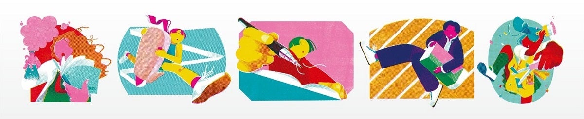 一乗氏の大胆な構図とビビットな色づかいのイラストと、エネルギー溢れる学生との親和性の高さからコラボレーションが実現しました。文具を持った人物が活き活きとしている様子を描き、学生の躍動感やバイタリティを表現しています。持っているだけで気分が上がるような遊び心あふれる表現で、キャンパス50周年を彩っています。