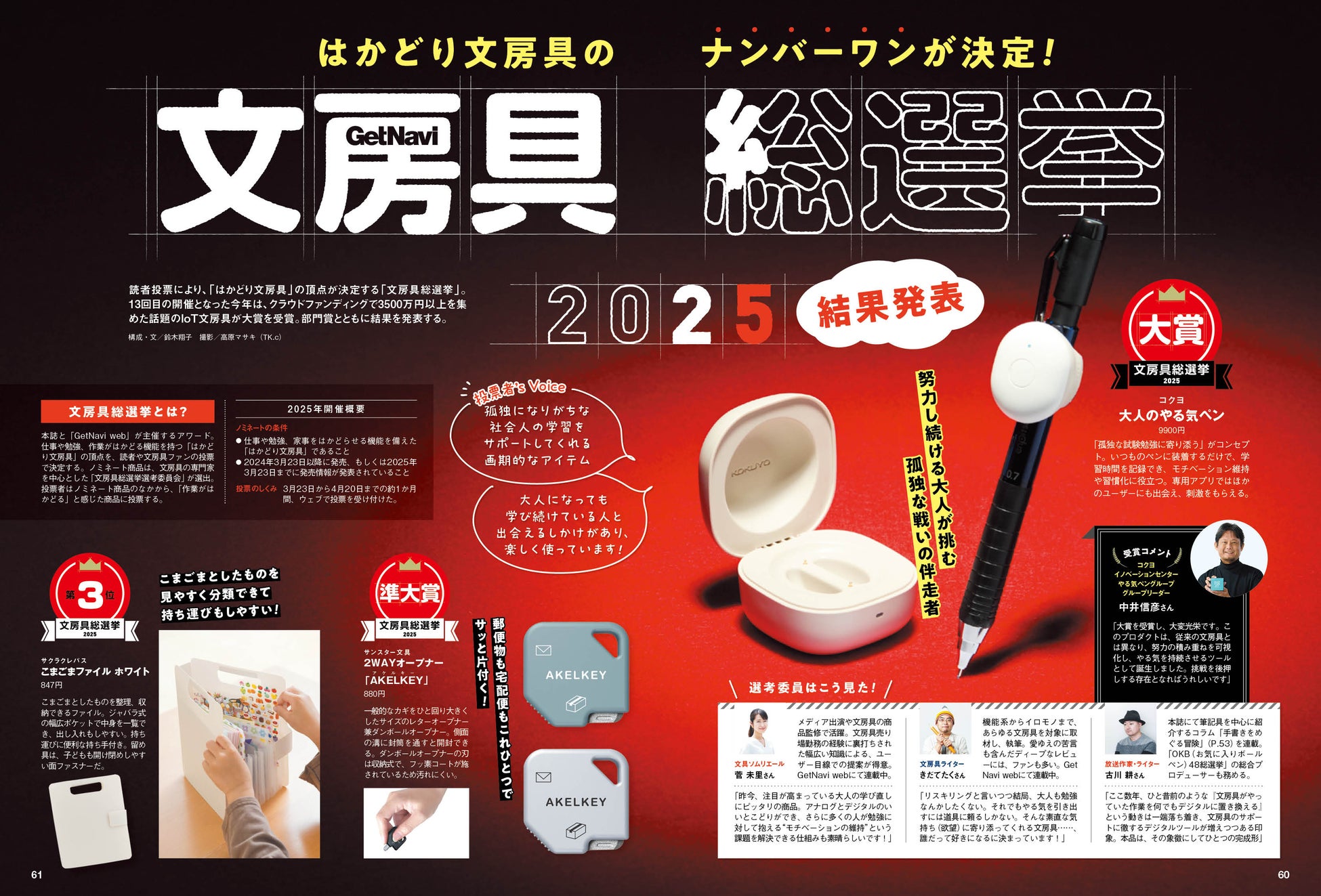 「文房具総選挙」とは、本誌と「GetNavi web」が主催するアワード。仕事や勉強、作業がはかどる機能を持つ「はかどり文房具」の頂点を、読者や文房具ファンからの投票で決定します。ノミネート商品は、文房具の専門家を中心とした「文房具総選挙選考委員会」が選出。読者の皆さまに今年3月23日から4月20日までの約1か月間、ノミネート商品のなかから、「作業がはかどる」と感じた商品にウェブにて投票していただきました。大賞と部門賞を発表します!