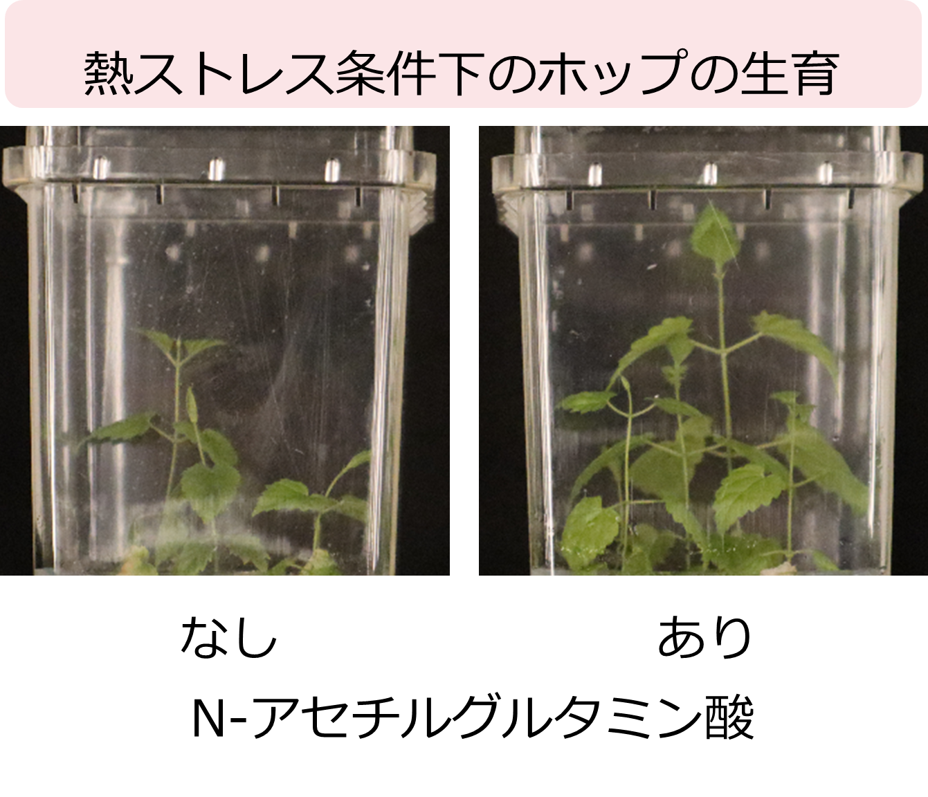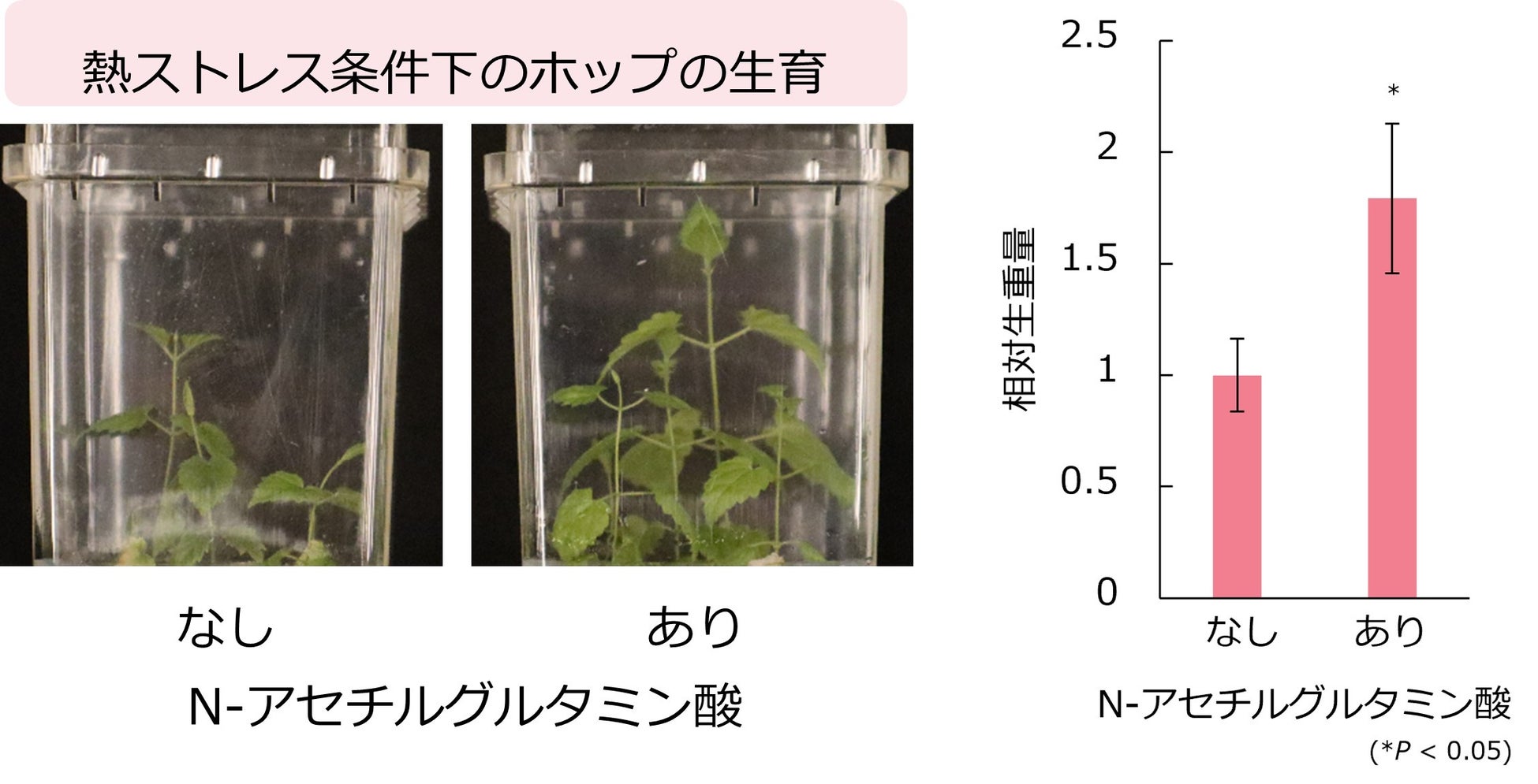 1)アミノ酸の一種であるN-アセチルグルタミン酸(NAG)がホップに対する熱ストレスを緩和することを明らかにしました。実験室内の試験において、熱ストレス条件下における植物体の生重量がNAG処理によって約1.5倍増加しました。
