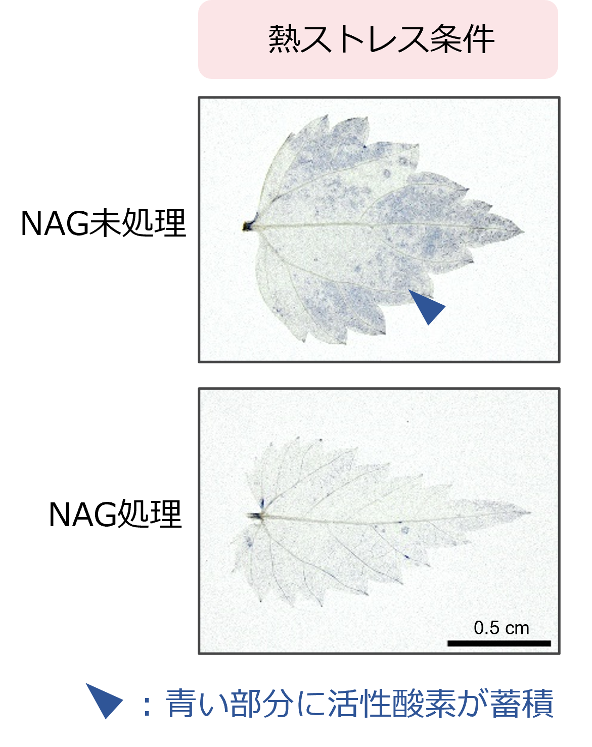 以上の結果より、NAGは熱ストレス応答遺伝子の活性化を通じて、ストレスによる細胞へのダメージを抑制しホップに熱ストレス耐性を付与していることが示唆されました。