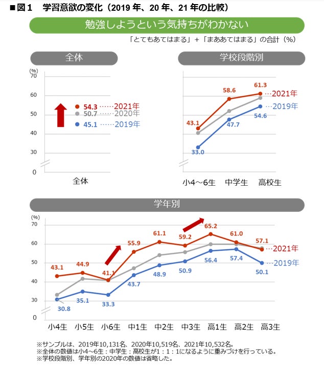 東京大学社会科学研究所・ベネッセ教育総合研究所 共同研究プロジェクト 「子どもの生活と学びに関する親子調査2021」結果速報 3年間で「勉強する気持ちがわかない」が半数以上に 学習意欲は低下傾向