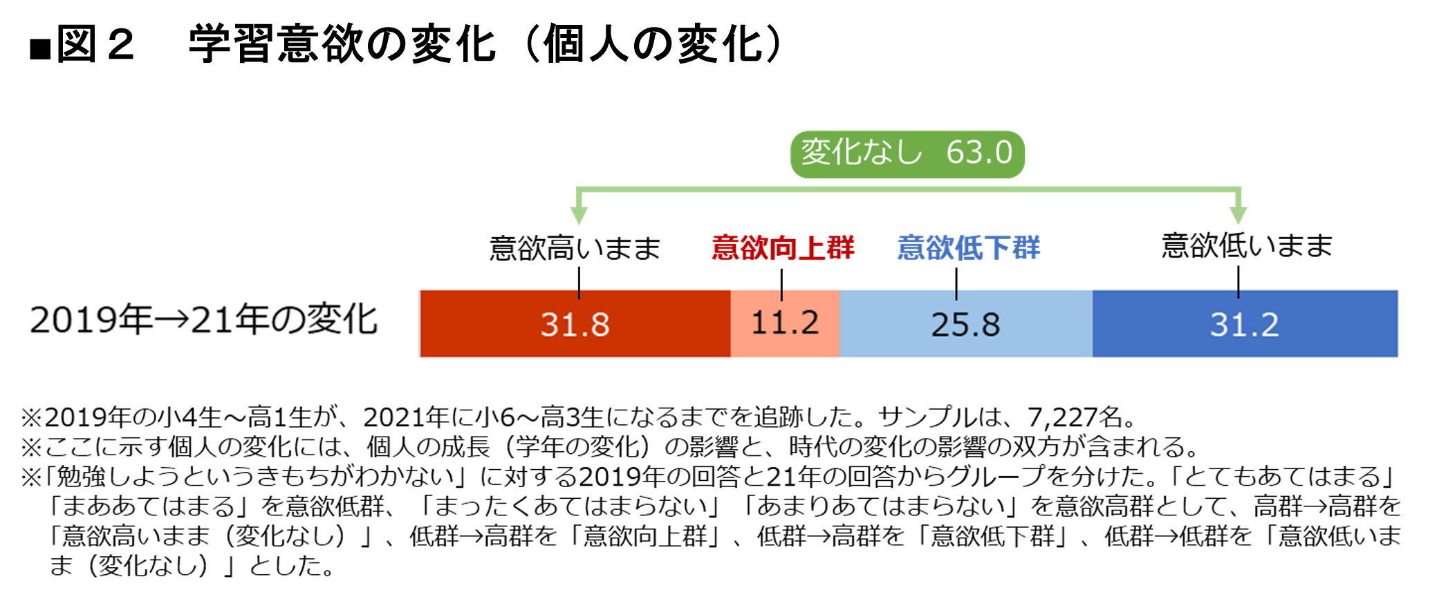 ◆同じ子どもの変化に注目すると、2019年から21年の3年間で学習意欲が向上した子ども(意欲向上群)は11.2%、低下した子ども(意欲低下群)は25.8%、変化がなかった子どもは63.0%でした。