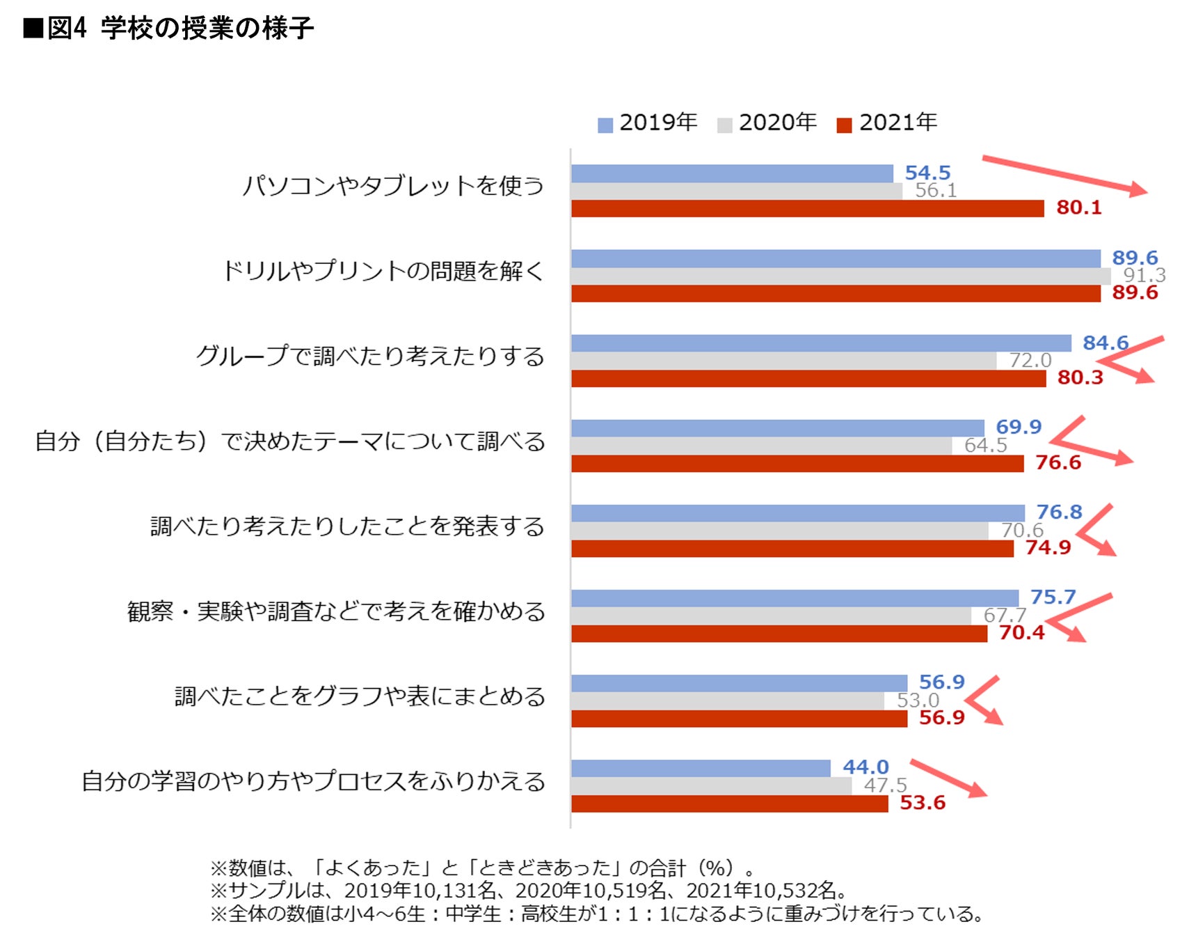 ◆授業形態については、「パソコンやタブレットを使う」が2020年→21年にかけて大きく増加したほか、20年に落ち込んでいた「グループで調べたり考えたりする」「テーマについて調べる」などの授業形態が回復しつつあります。