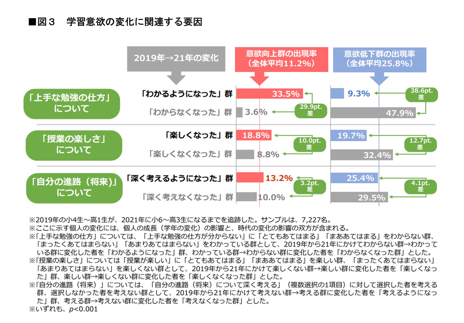 ◆同じ子どもの変化に注目すると、2019年から21年の3年間で学習意欲が向上した子ども(意欲向上群)は11.2%、低下した子ども(意欲低下群)は25.8%でした。
