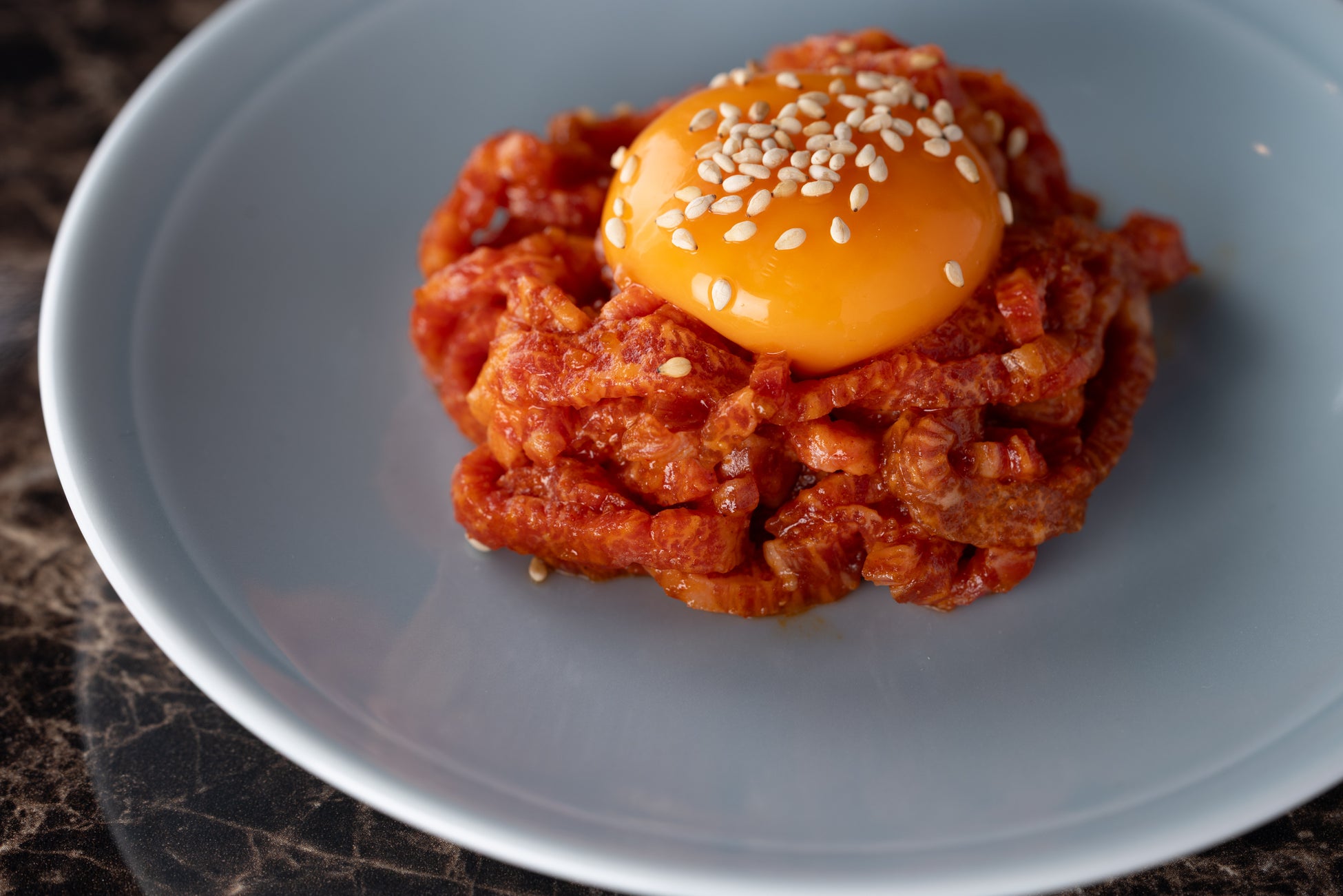 生食許認可取得の安全・安心ユッケ。黒毛和牛ユッケを甘ダレと卵黄と絡めてお召し上がり下さい。