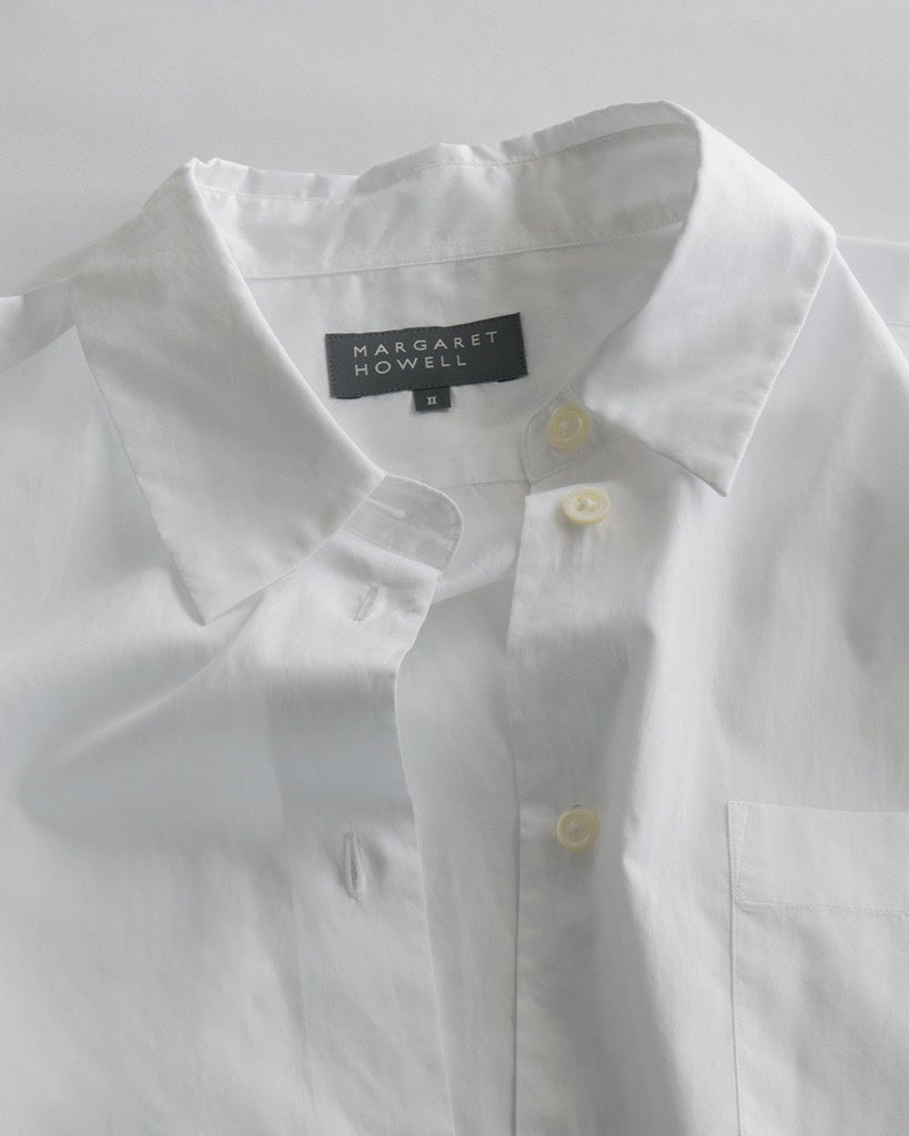 マーガレット・ハウエルのシャツは、素材感やパターン、細かなパーツ使いやディテールなど様々な要素をシーズンごとに緻密に計算して作られています。ウィメンズの限定シャツは、ブランド定番素材であるスイスコットンで作れたシンプルシャツとロングカラーレスシャツ。フラットで繊細な生地感と上質なコットンが持つ控えめな美しい光沢感が特徴です。メンズの限定シャツは、同じくしなやかで光沢のあるスイスコットンを使用したレギュラーカラーシャツで、胸ポケットにマーガレット・ハウエル手書きのイニシャルがベースとなったデザインが刺繍されている特別な一枚です。