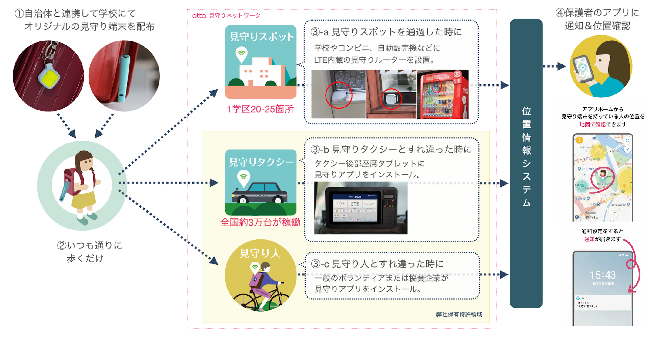 全ての子どもたちに見守り端末を無償で配布し無料で利用できる緊急時のセーフティーネットを構築。見守り端末を持っている子どもが、見守りスポットを通過した記録と「見守り人」とすれ違った際に位置情報が記録されます。